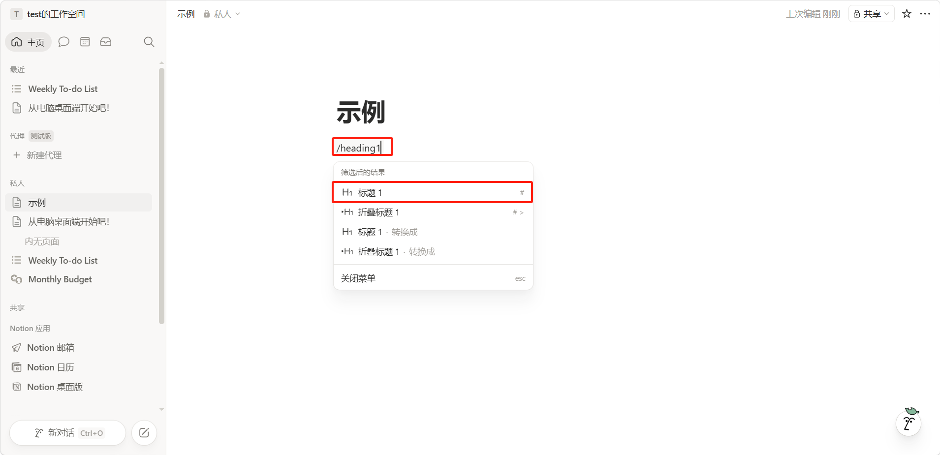 先输入「/heading1」选择一个大标题,命名为"读书笔记"。