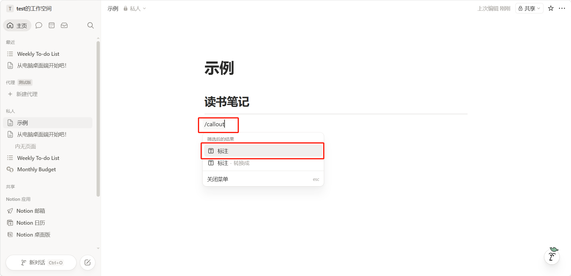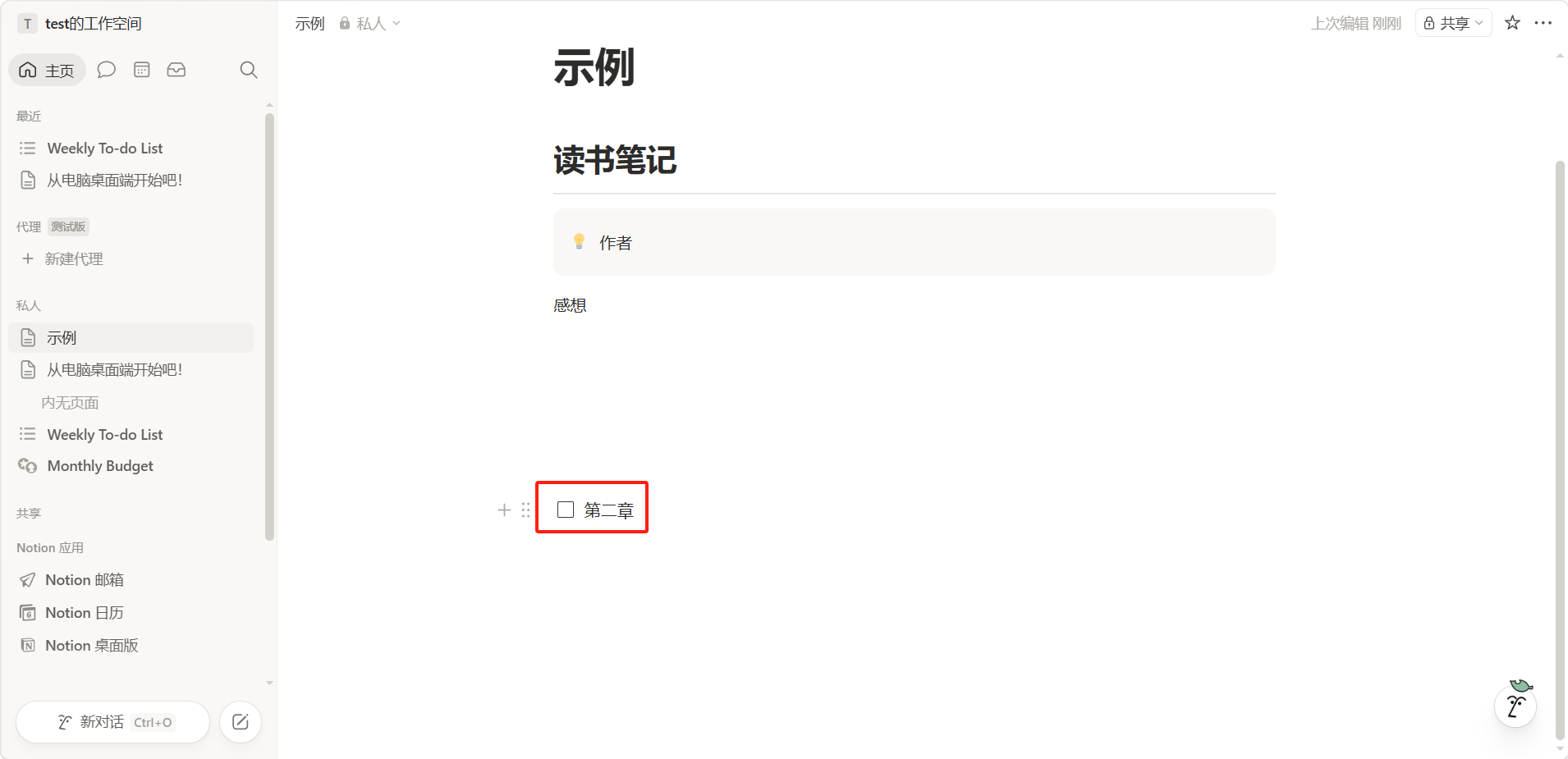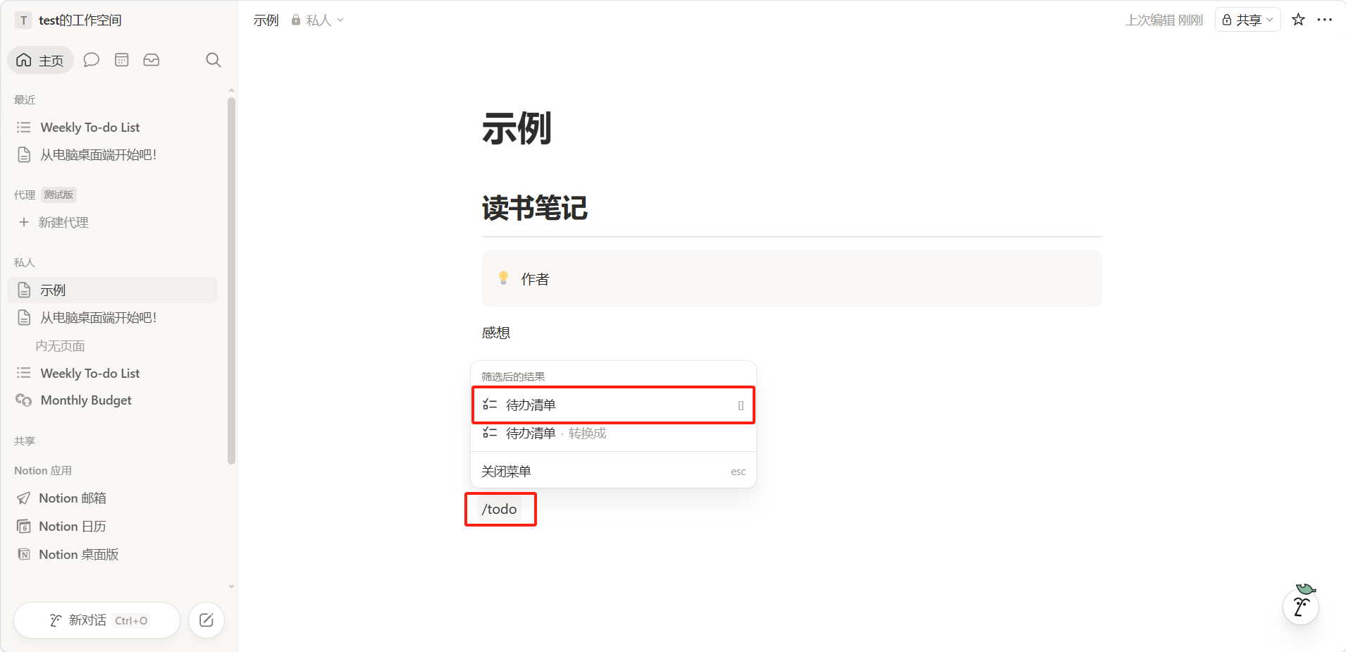 接着用普通文本区块写下你的感想,最后用「/todo」添加几条待办事项记录接下来要读的章节。