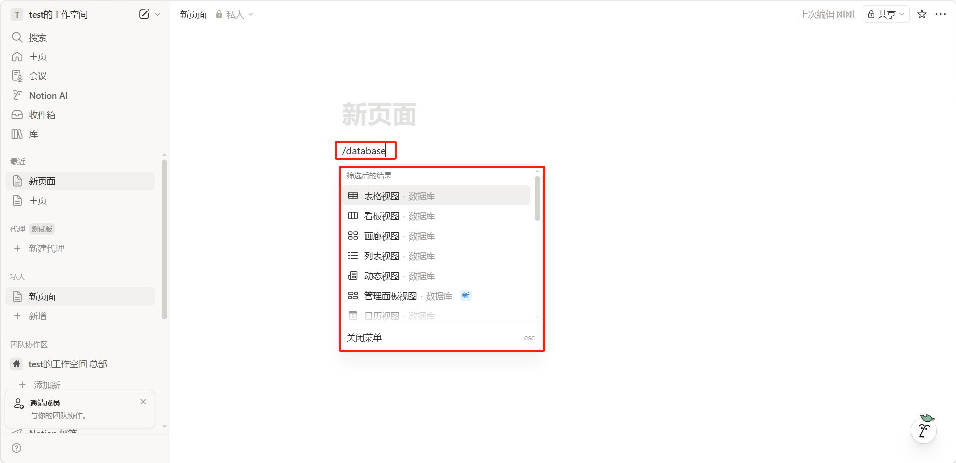 在页面中输入「/database」,选择需要的数据库类型。