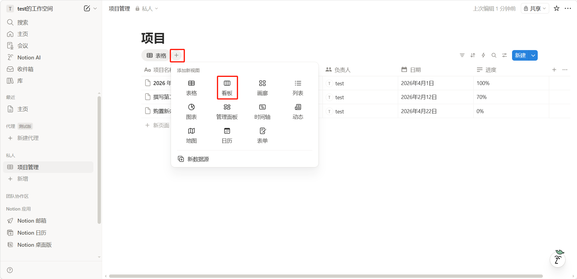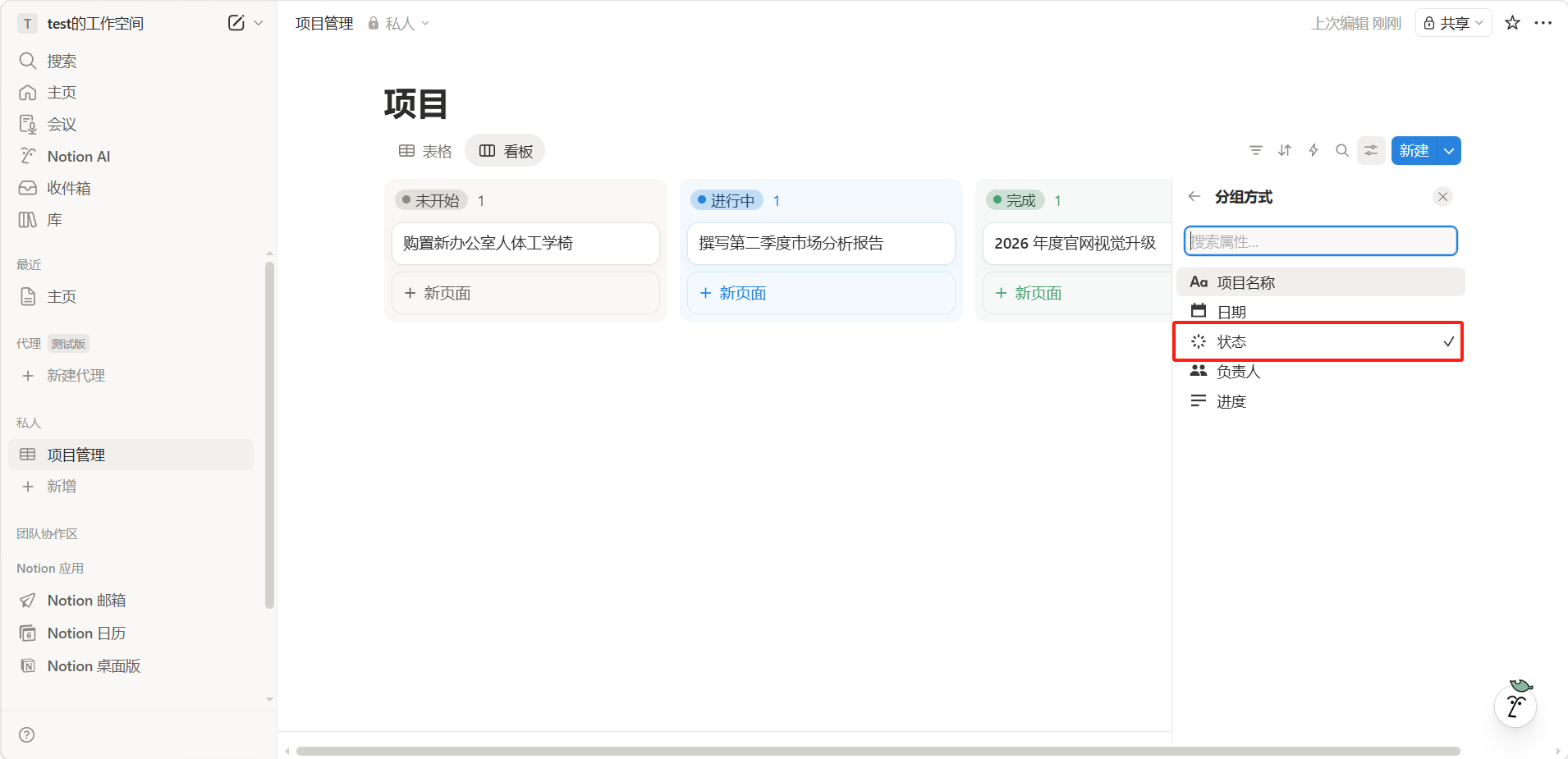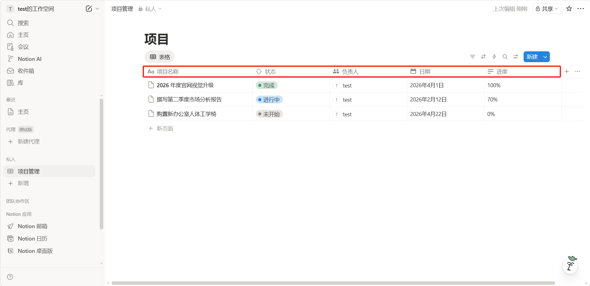 添加以下属性:项目名称(标题)、状态(选择:待开始/进行中/已完成)、负责人(人员)、截止日期(日期)、进度(文本)。