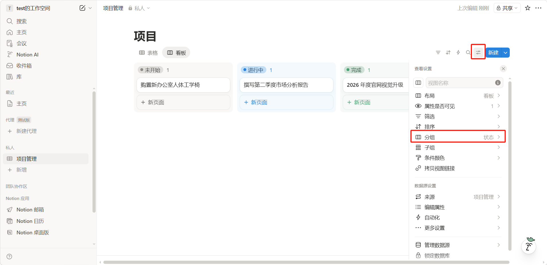 将视图按"状态"分组。