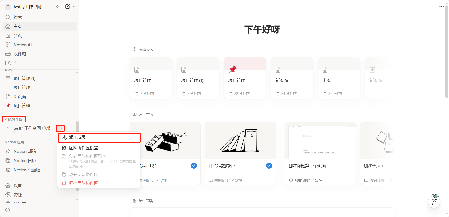 点击侧边栏底部团队协作区的「添加成员」按钮。