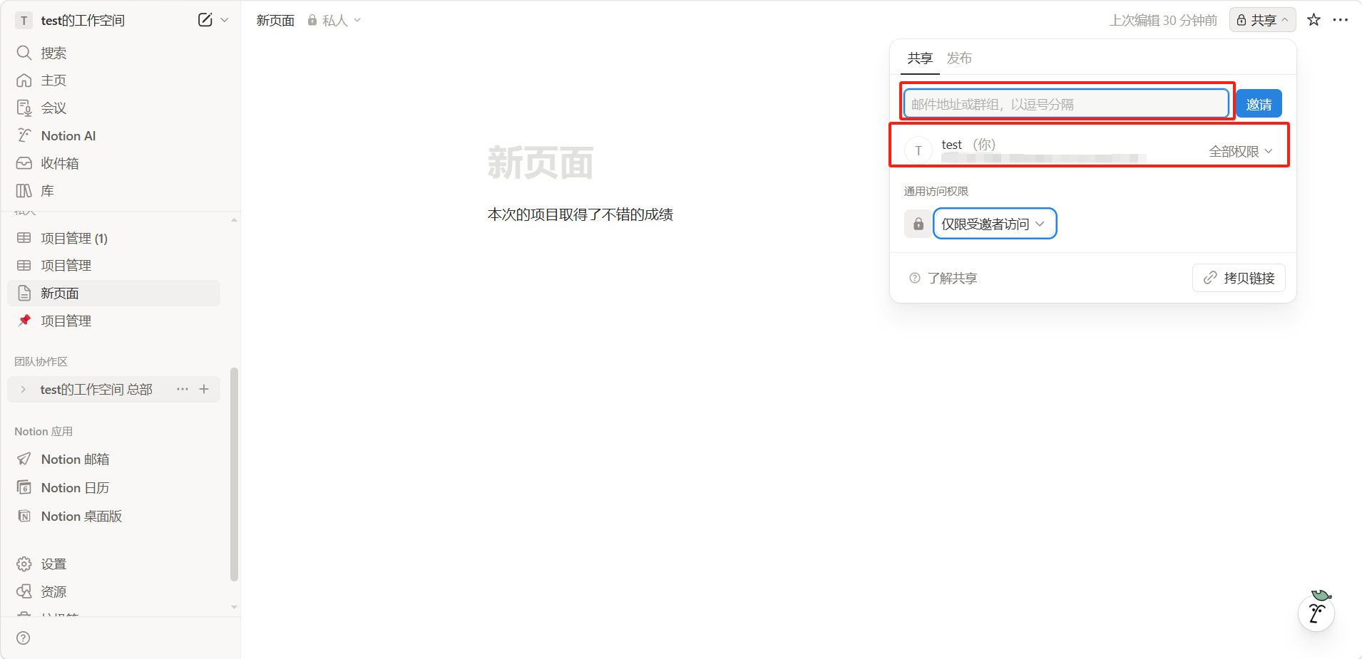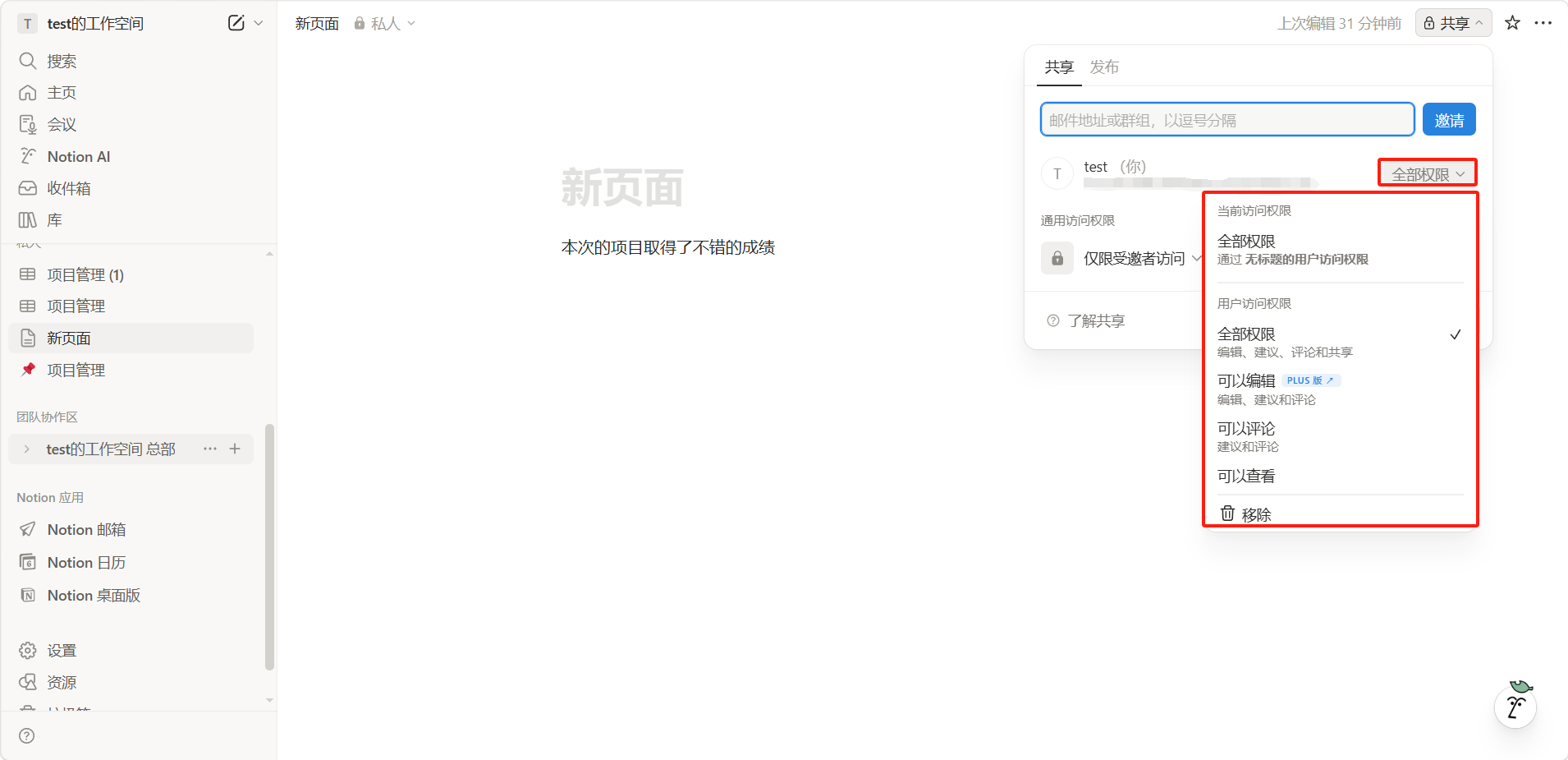 Notion 提供了灵活而强大的共享与协作机制。你可以精细地控制谁能访问你的页面,以及他们拥有什么级别的权限。无论是团队内部协作还是与外部伙伴共享,Notion 都能满足需求。协作功能贯穿 Notion 的各个层面——从整个工作空间到单个页面,都可以独立设置权限。