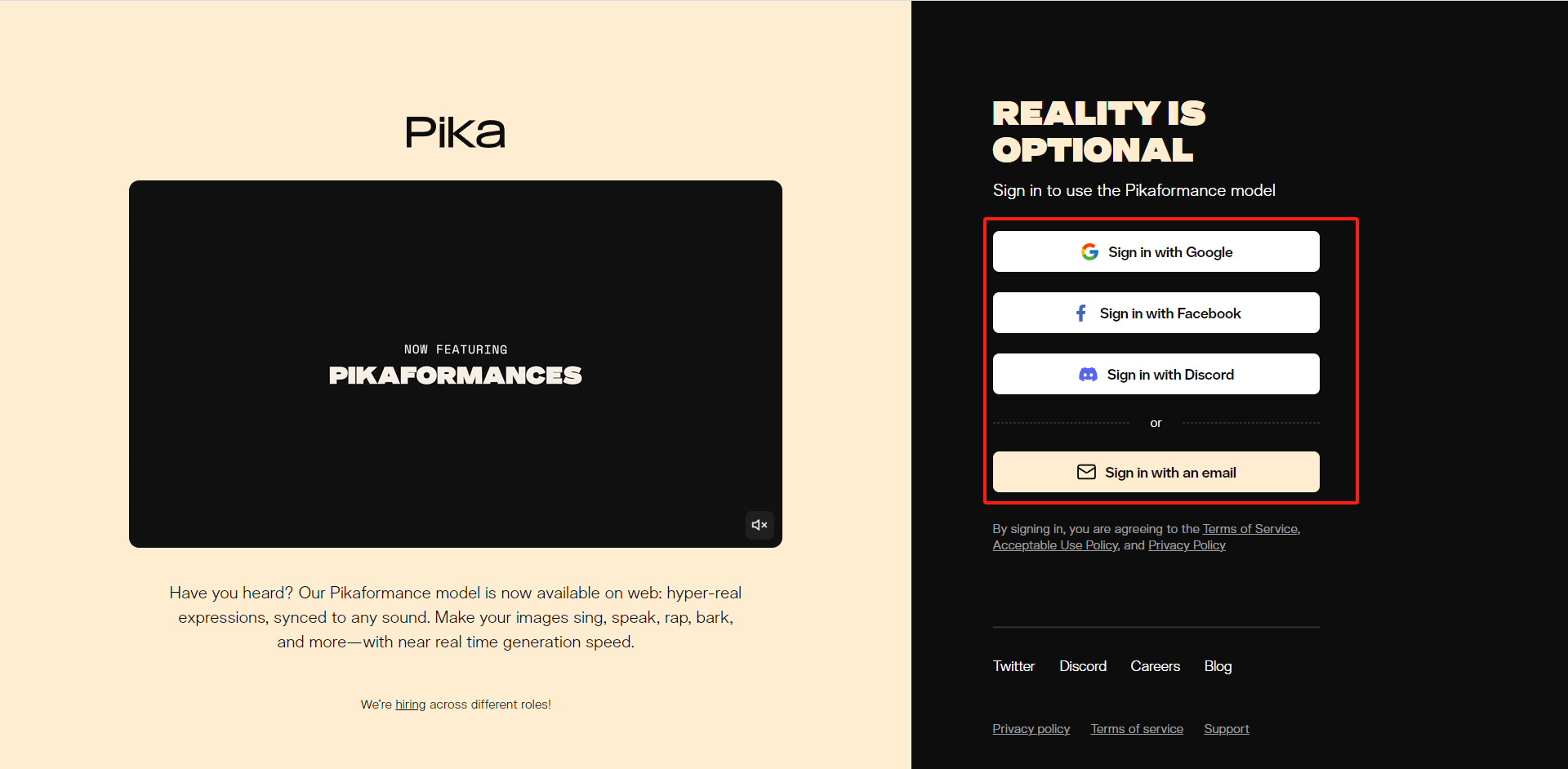 点击页面上的「Try Pika(试用 Pika)」或「Log in(登录)」按钮