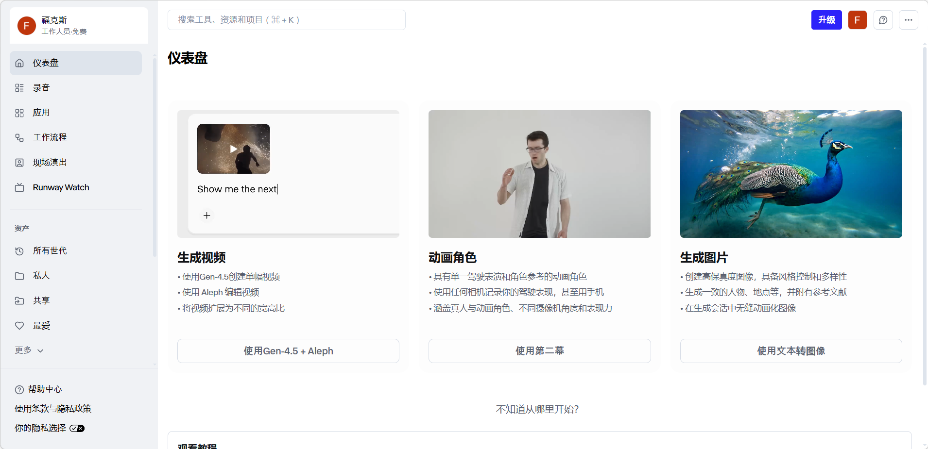 仪表盘是是整个平台的导航中心。从仪表盘可以快速进入各个功能模块,浏览最新生成的内容,以及搜索工具和资源。页面顶部有搜索栏,可以按名称查找工具、资源和项目。