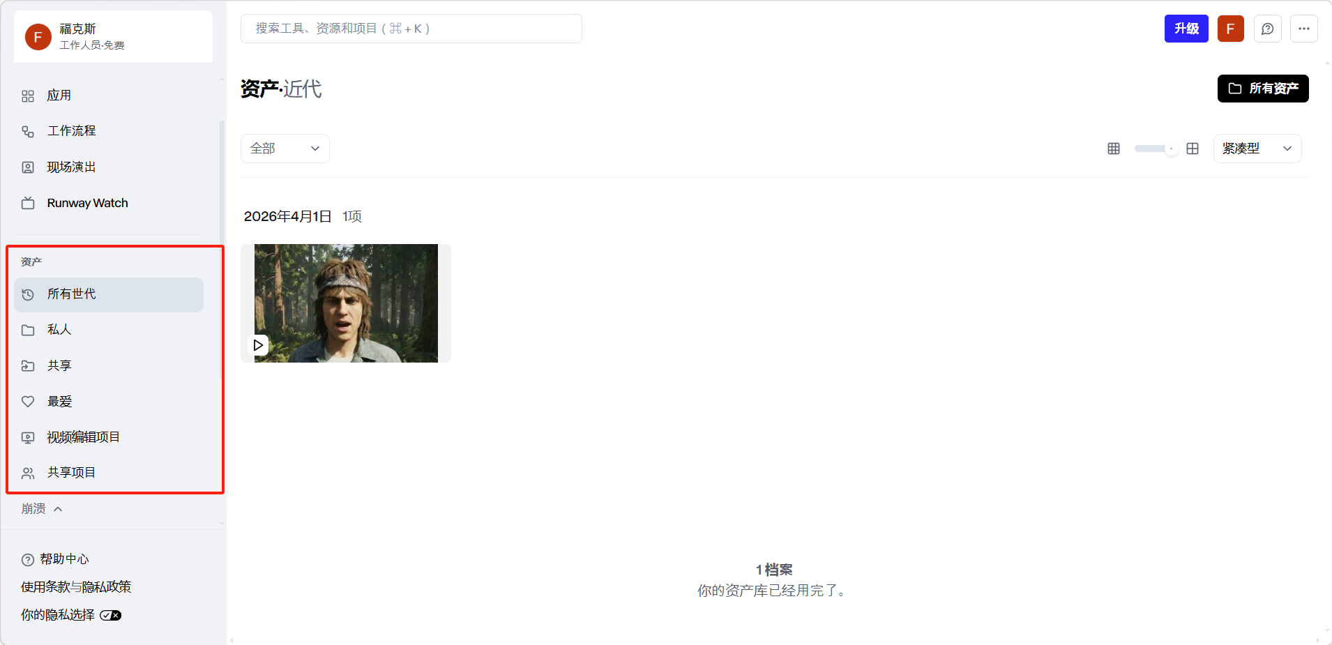 资产管理页面用于整理和查看用户的所有生成作品。用户可以按时间、类型筛选内容,支持网格视图和列表视图切换,还可以设置紧凑型或宽松型布局。所有生成的视频、图片和音频都会自动保存在这里,方便随时查找和下载。