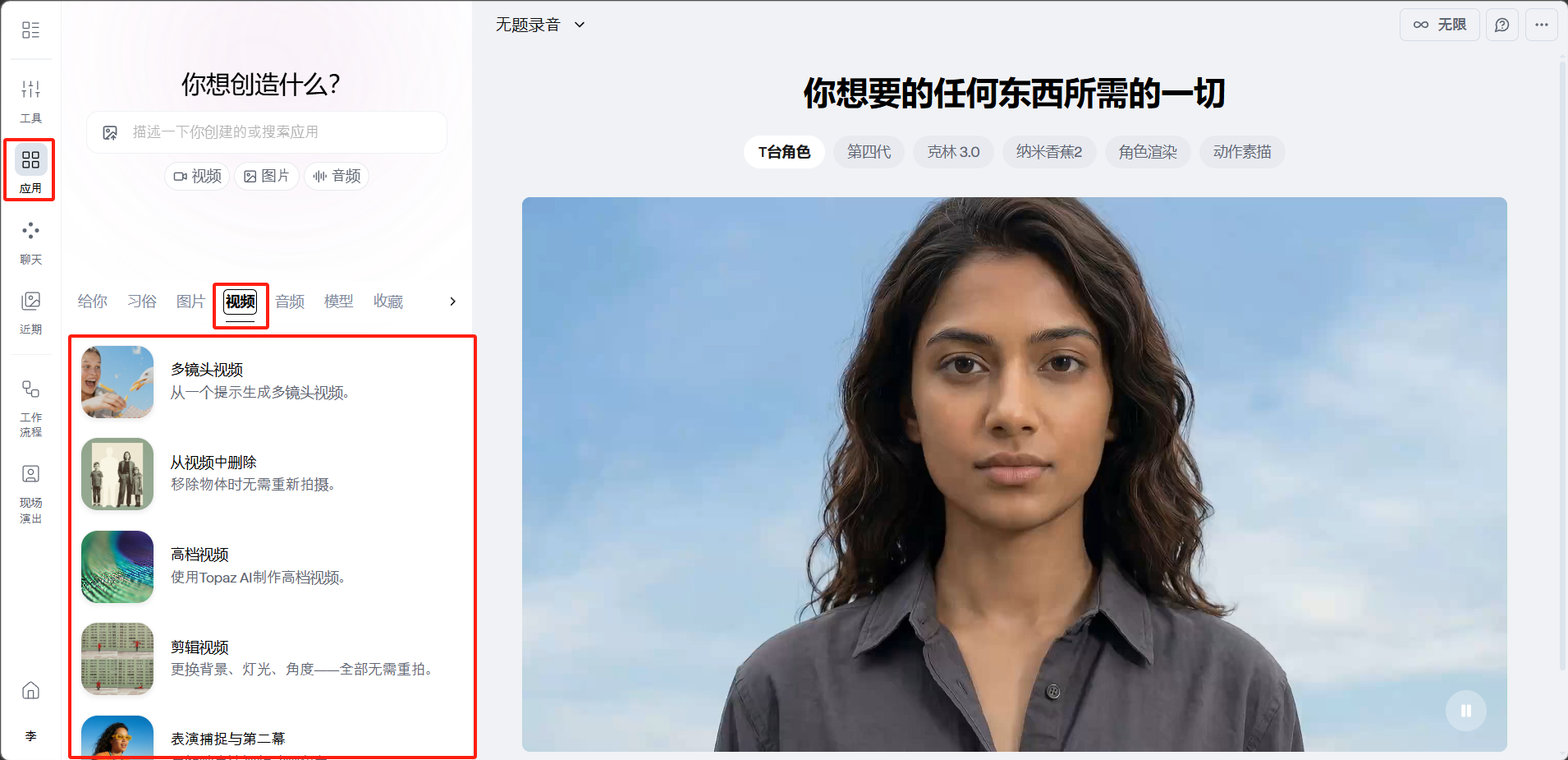 点击左侧导航栏中的「应用」图标,在顶部分类标签中选择「视频」,从应用列表中选择所需的视频工具。