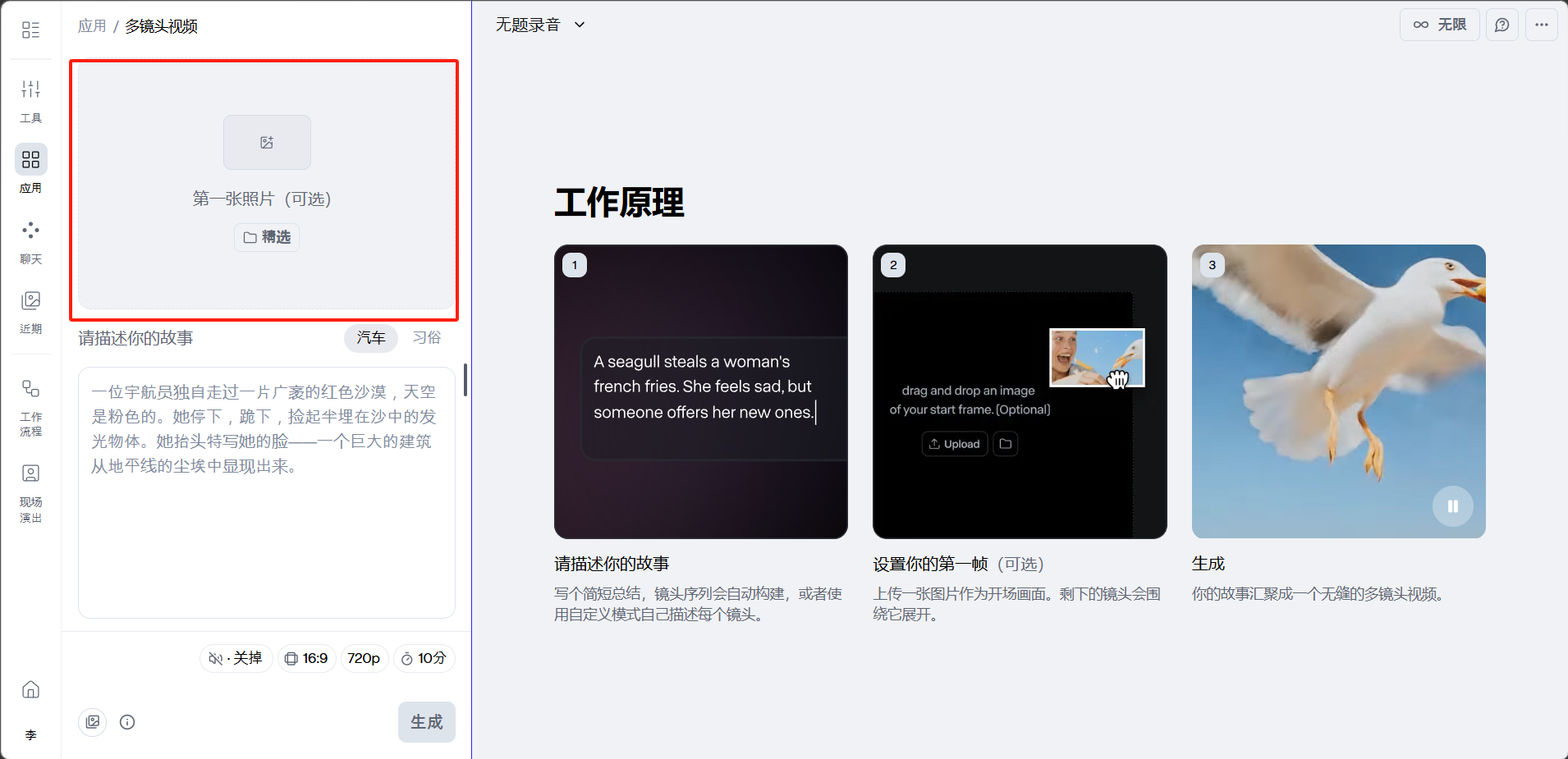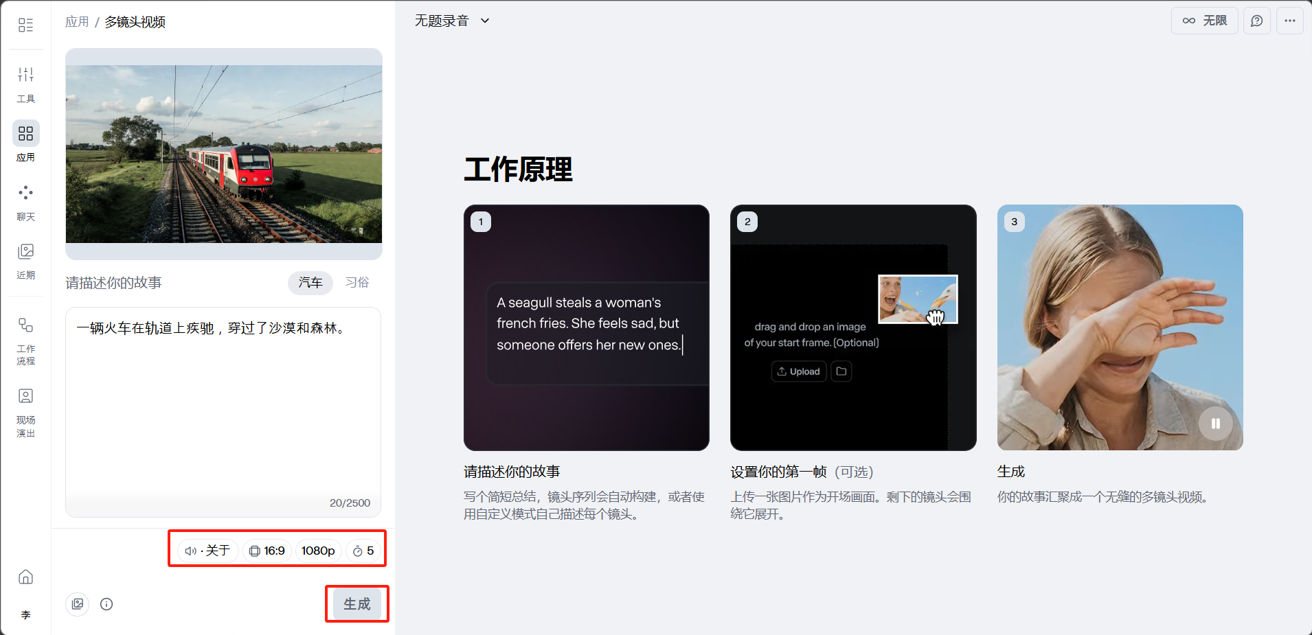 输入一段故事描述,自动拆分成多个镜头生成完整视频。