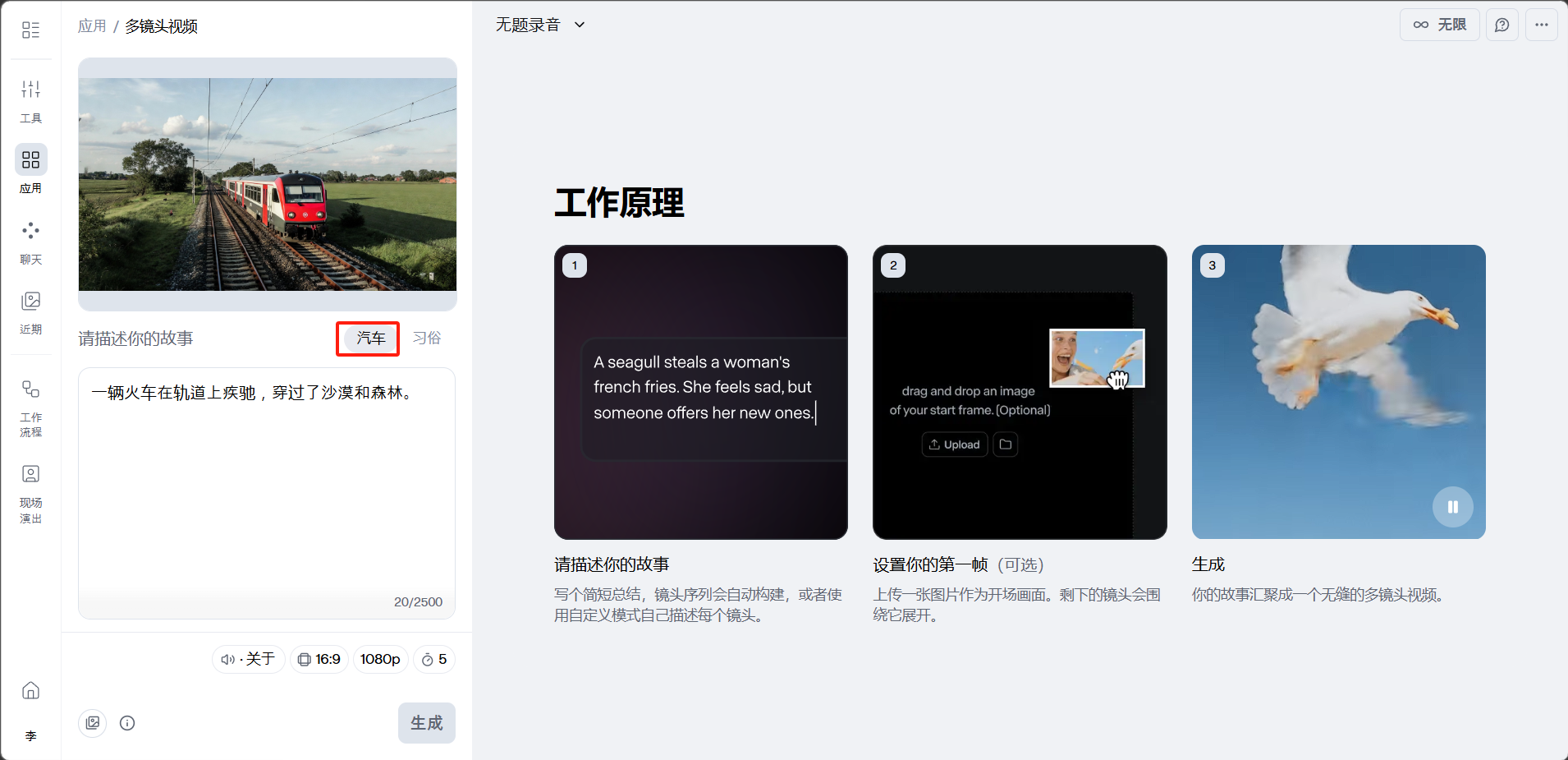 点击「自动」按钮,在文本框中输入故事描述,ai会自动生成镜头。浏览器可能会翻译为「汽车」。
