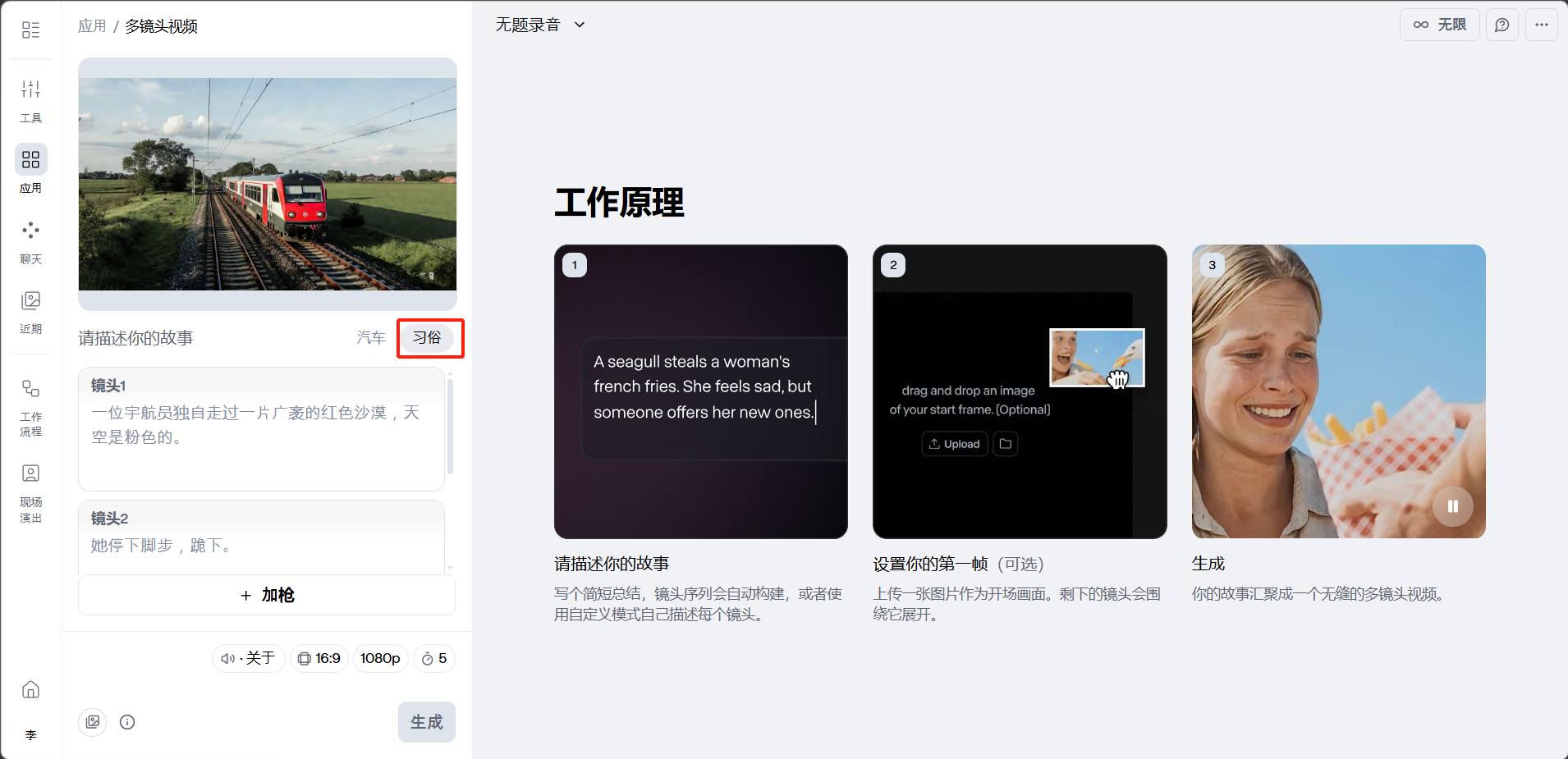 选择「镜头」按钮,可以手动描写每个镜头的内容,浏览器可能会翻译为「习俗」。