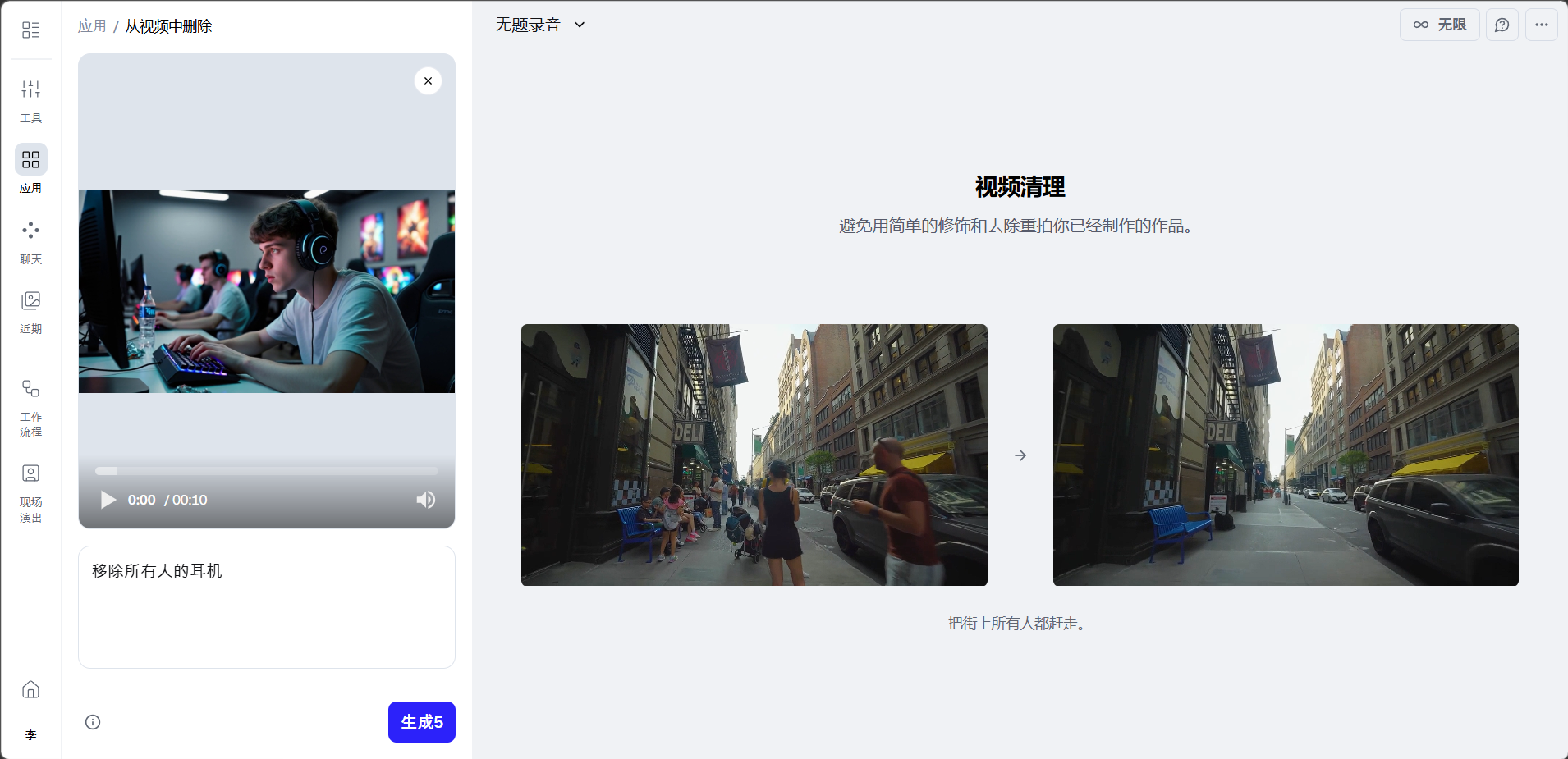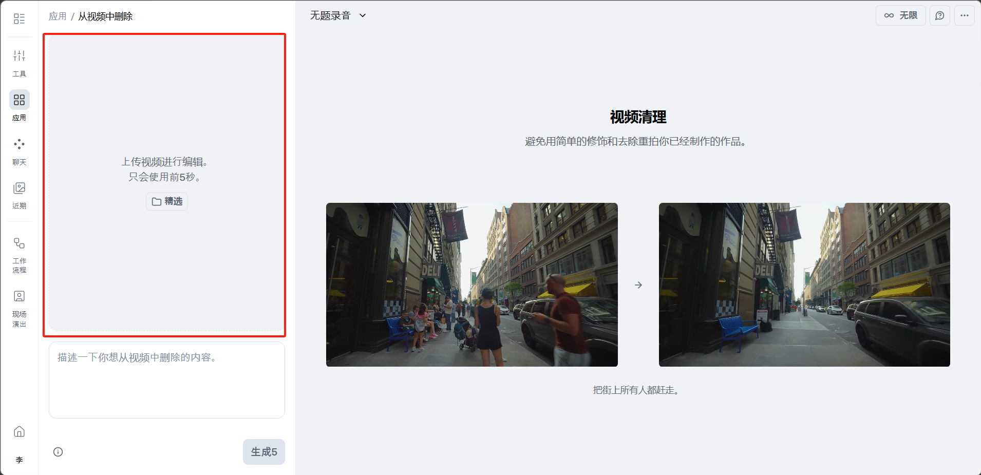 在下方文本框中描述想从视频中删除的内容,点击「生成」按钮处理。