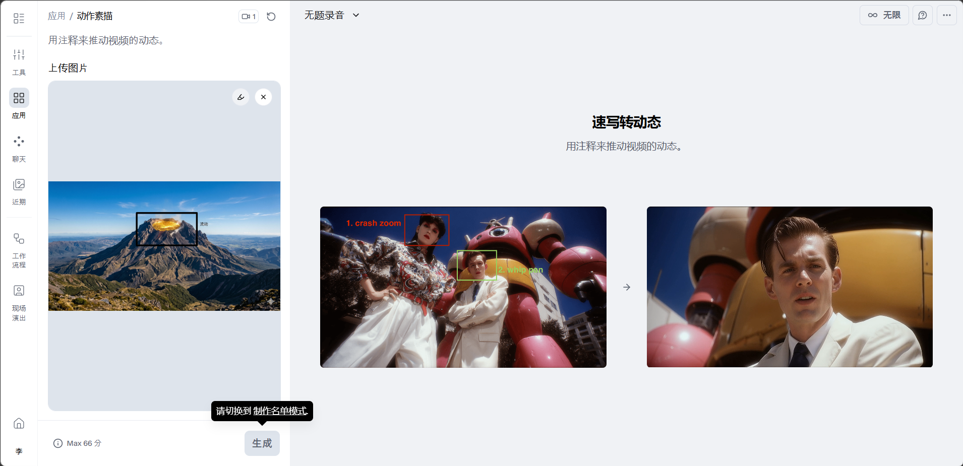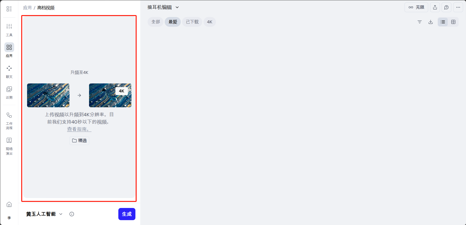 上传视频(目前支持 40 秒以下的视频),点击「生成」按钮即可。