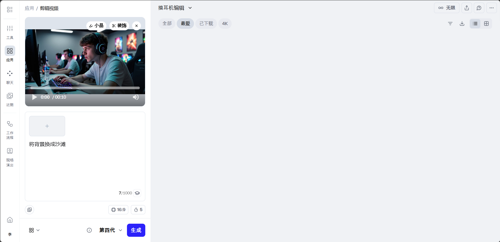 文本转视频:只需用文字描述想要的画面场景,AI 就能自动生成对应的视频片段。这种方式适合从零开始构思创意,生成 B-roll 素材、概念视频或特效片段。