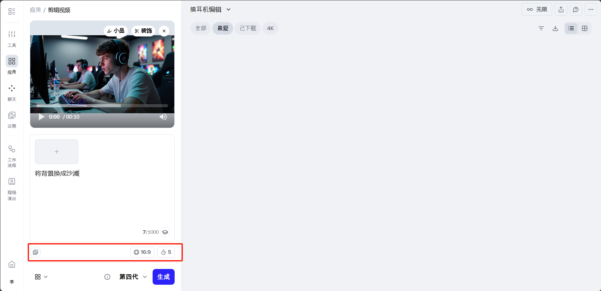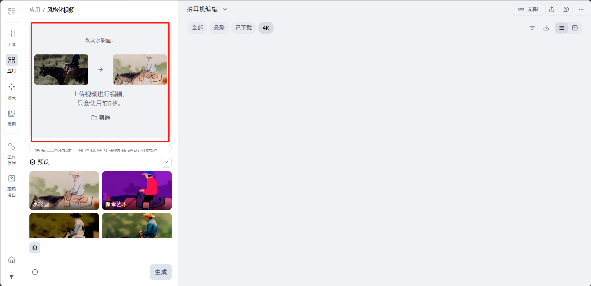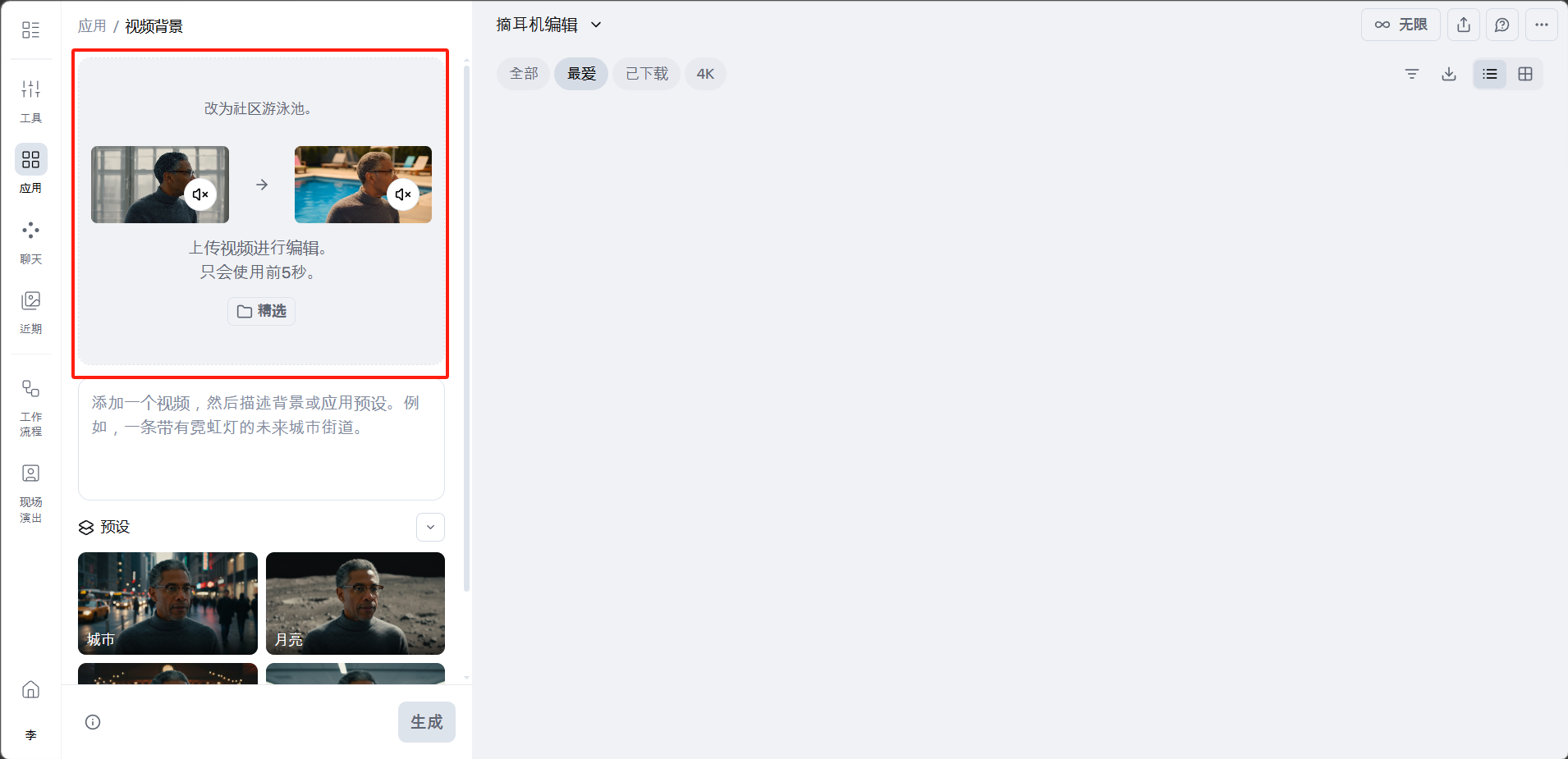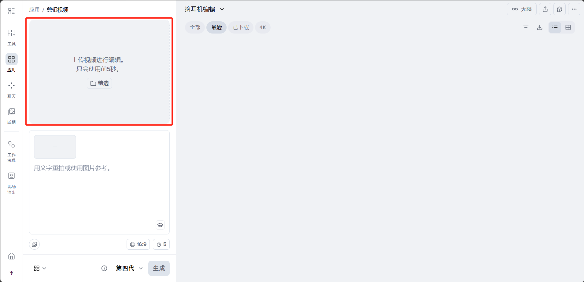 上传视频进行编辑(最多5秒),或点击「精选」使用素材库。