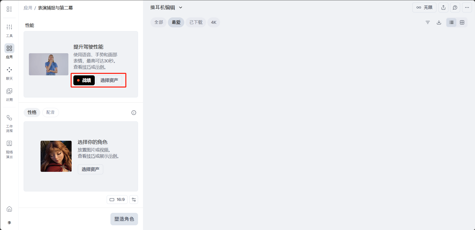 可以点击「录制」开始录制动作(最多 30 秒),浏览器可能会翻译为「战绩」。或点击「选择资产」上传已有素材。