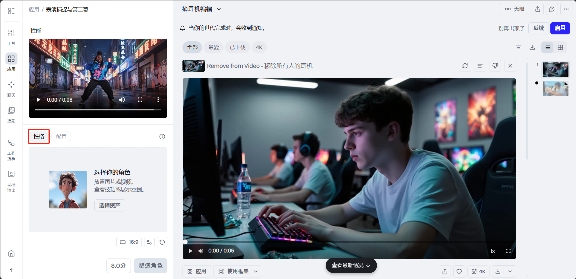 点击「角色」标签选择角色,浏览器可能会翻译为「性格」。上传图片或视频。