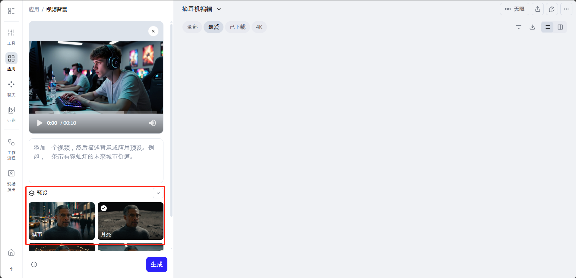 在文本框中描述背景,或选择下方预设,点击「生成」按钮即可。