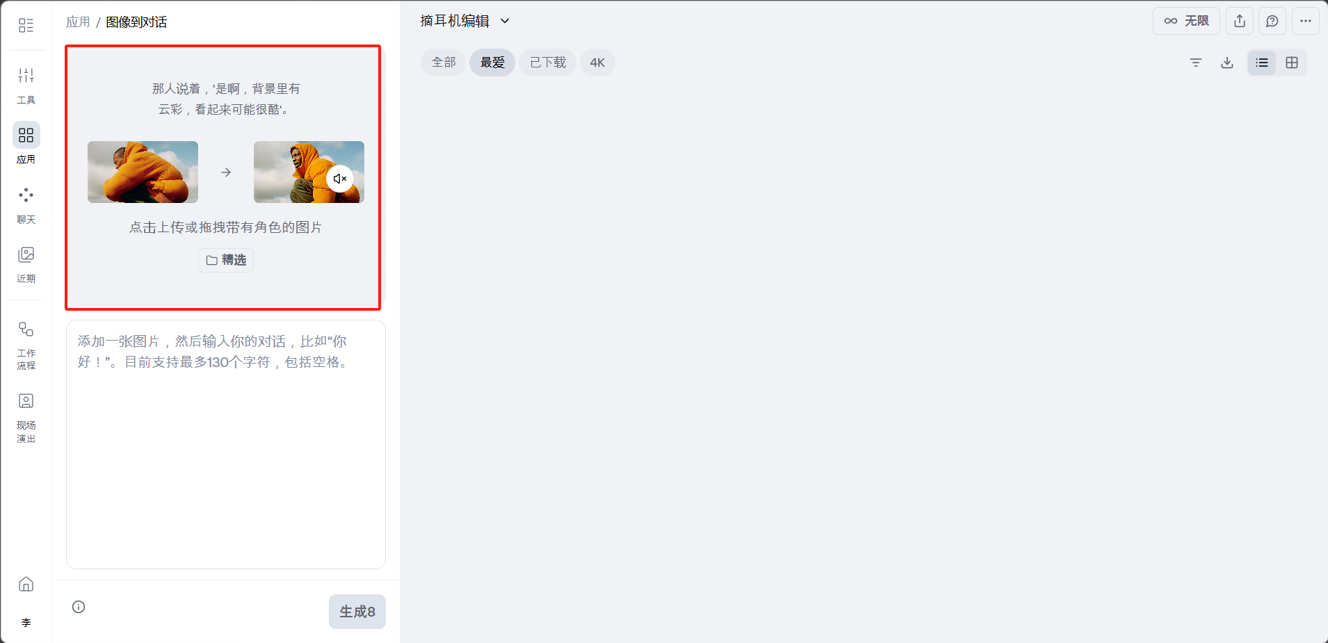 在下方文本框中输入对话内容(目前支持最多 130 个字符,包括空格),点击「生成」按钮生成。