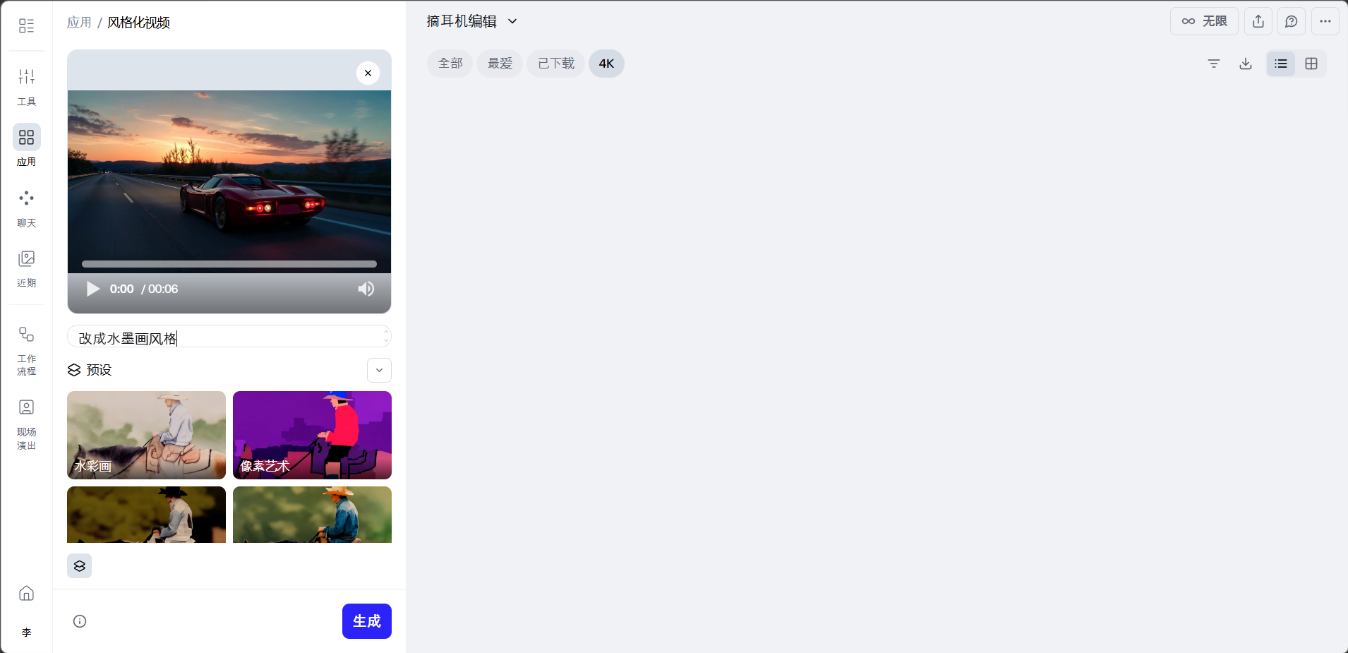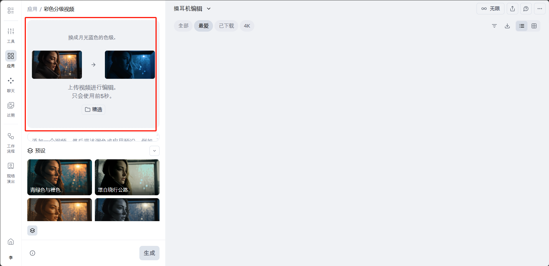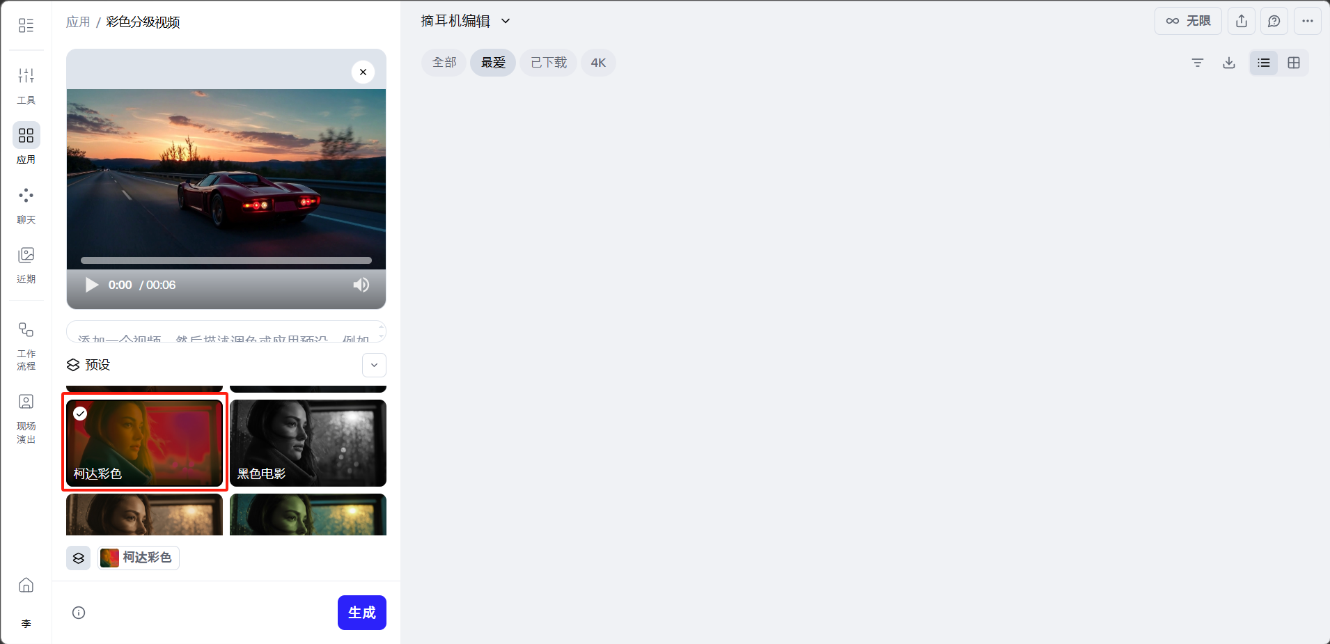 在文本框中描述调色风格,或选择下方预设,点击「生成」按钮即可。