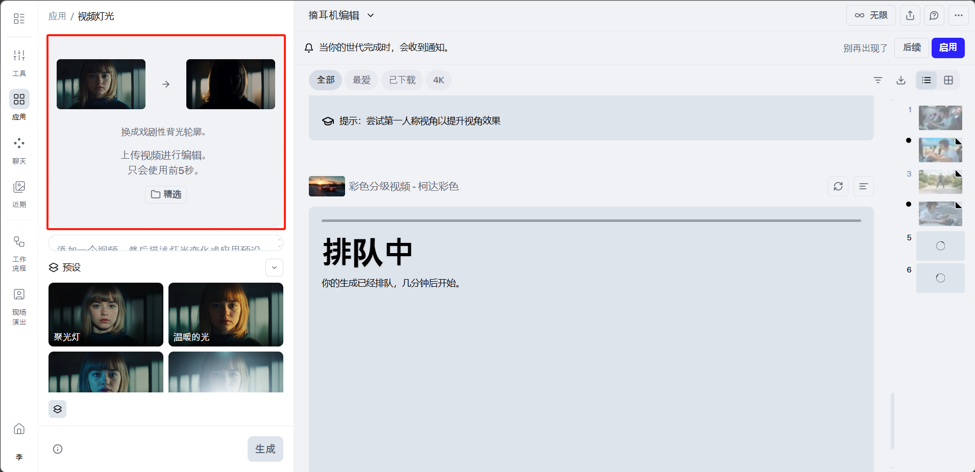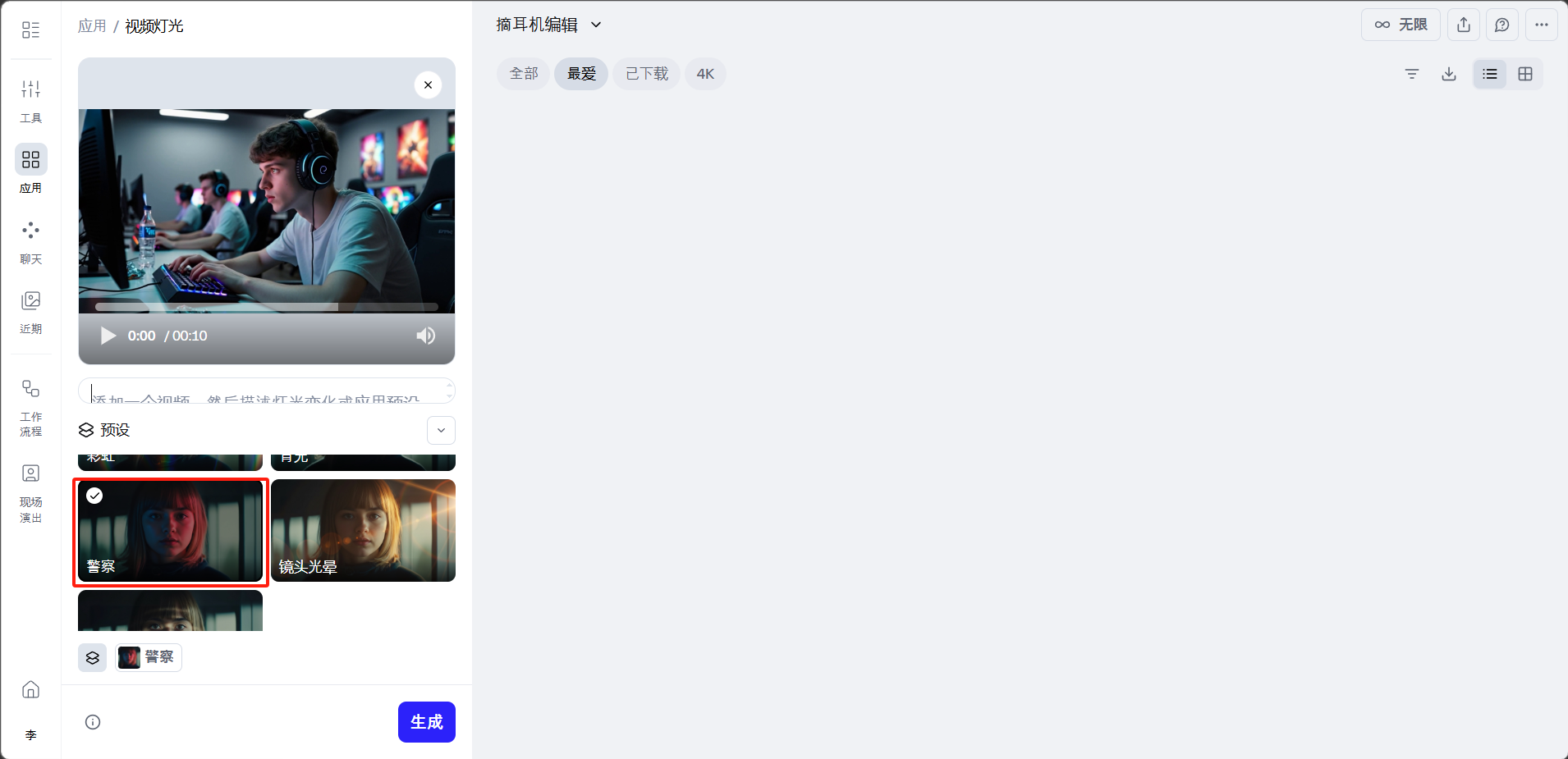 在文本框中描述灯光变化,或下方预设,点击「生成」即可。