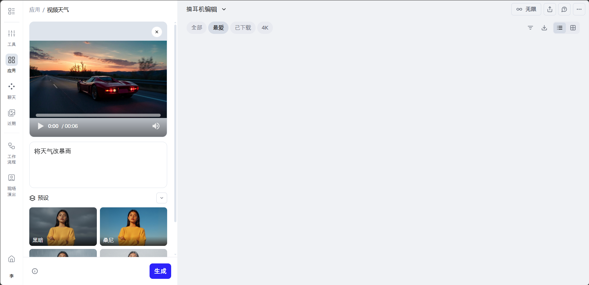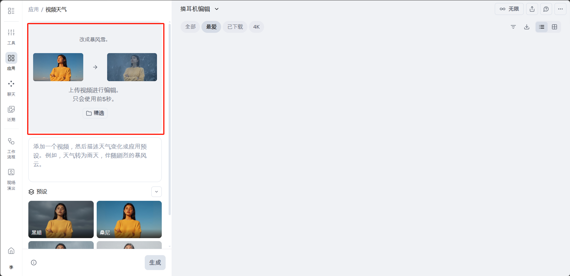 在文本框中描述天气变化,或应用下方预设,点击「生成」。