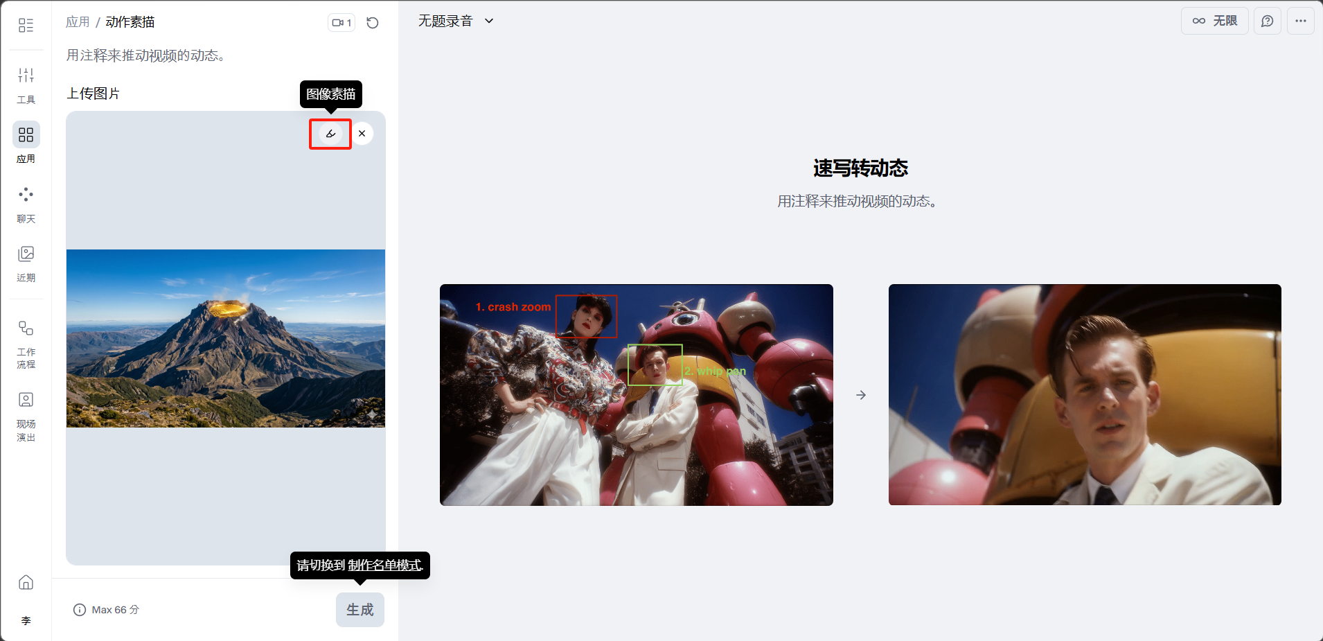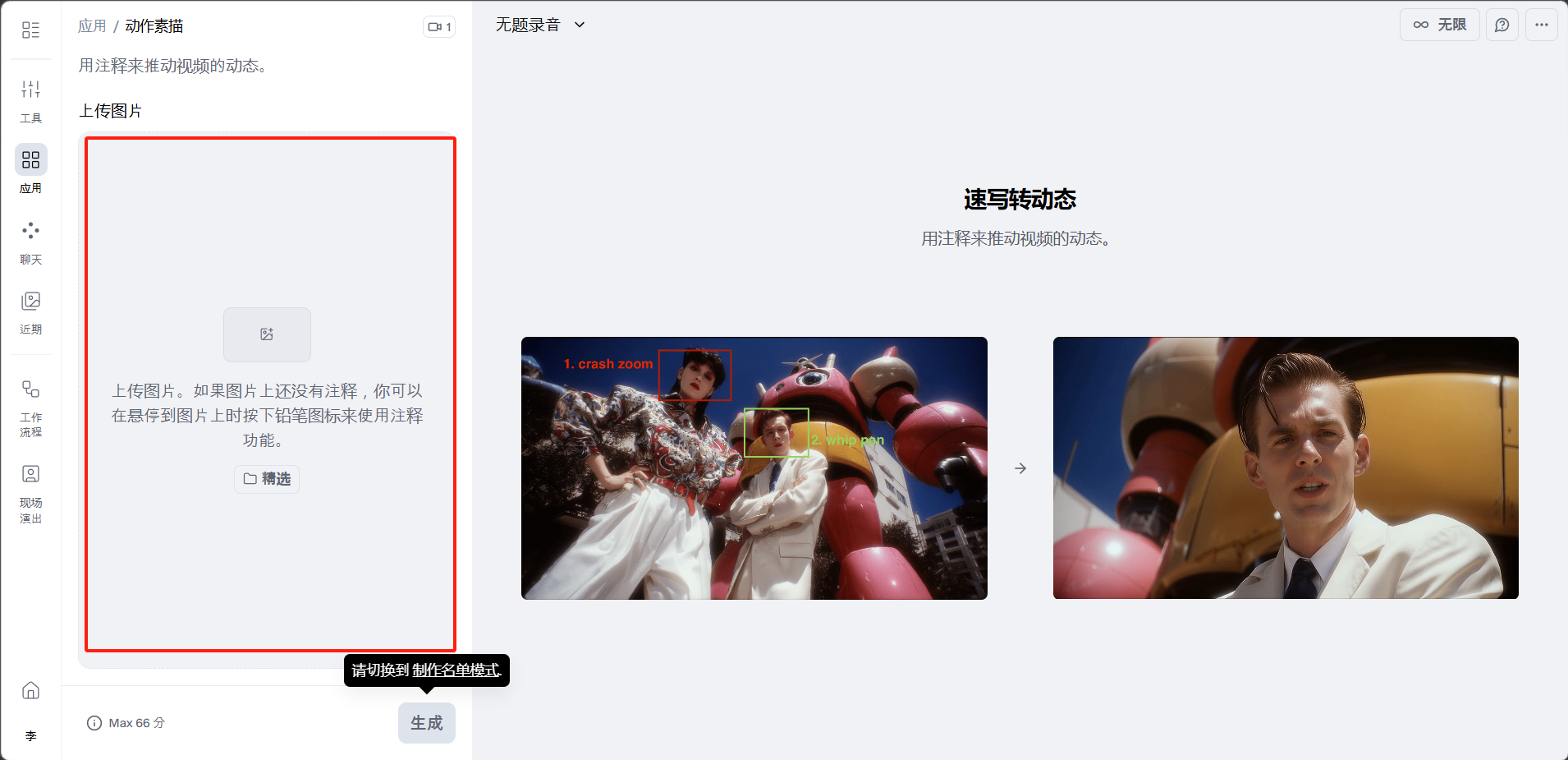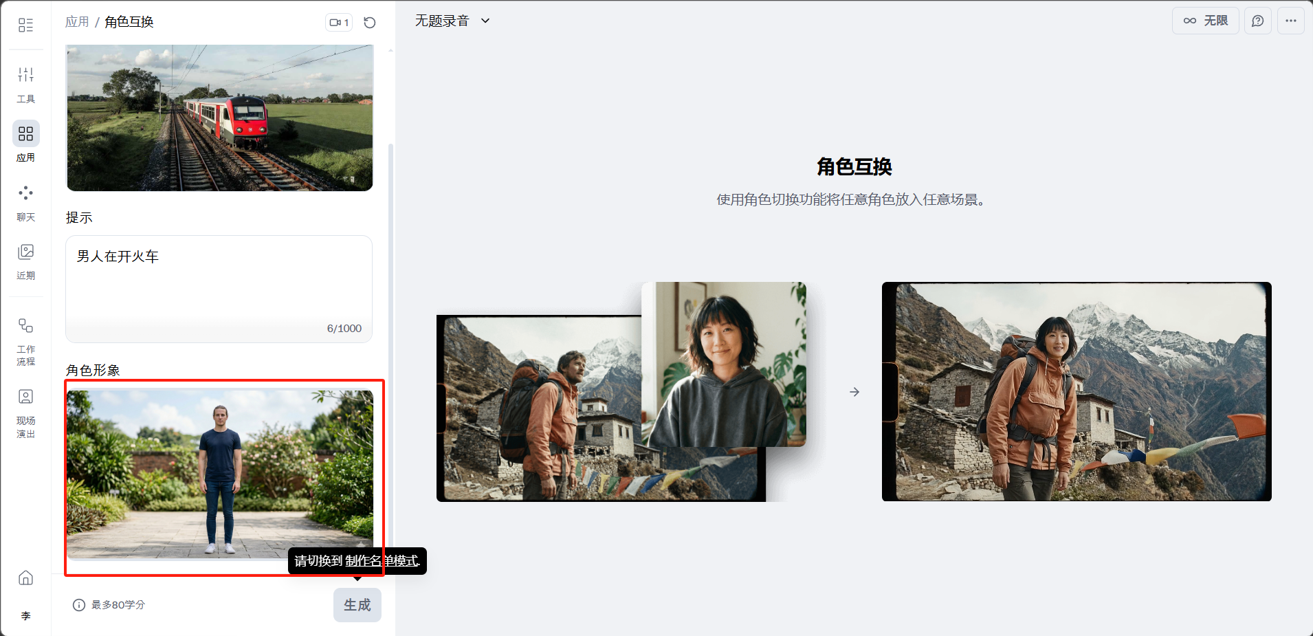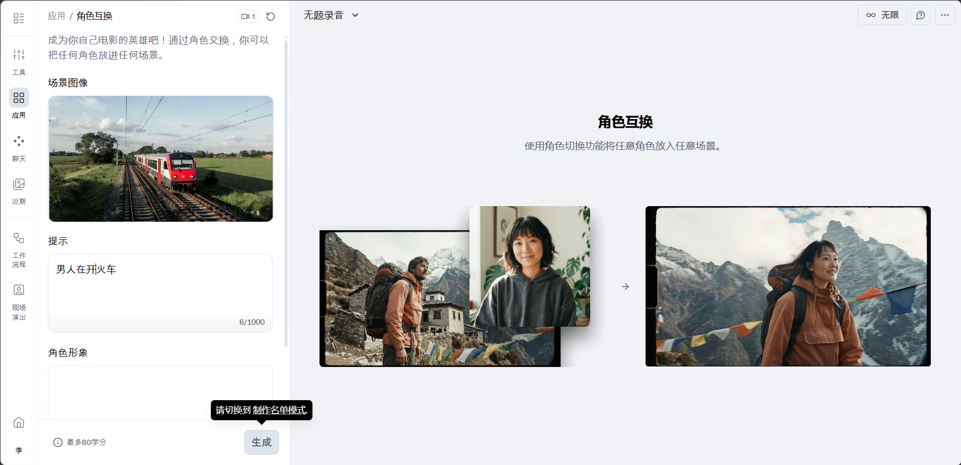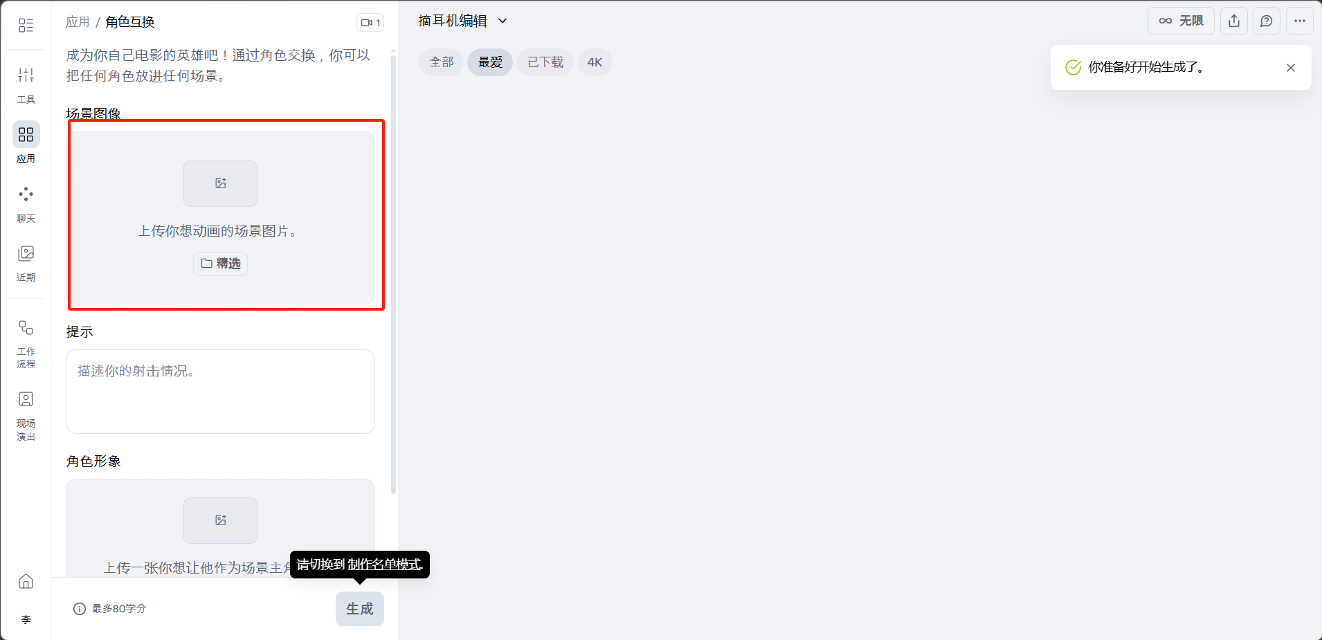 上传作为场景主角的角色图片,点击「生成」按钮生成。