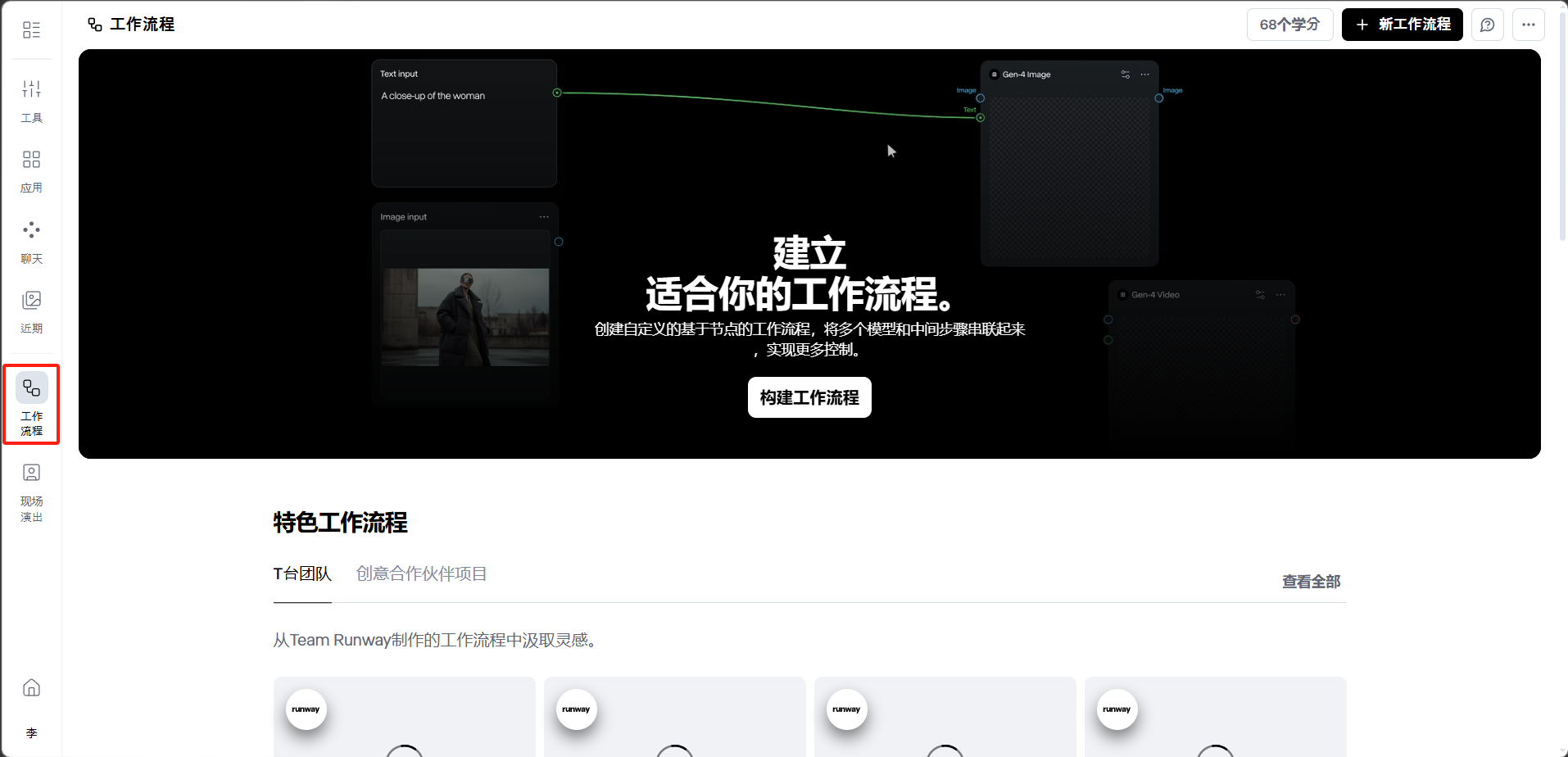 工作流页面的顶部有一个可视化的节点编辑器示意区域,展示了如何将文本输入、图片输入等源节点与 Gen-4 Image、Gen-4 Video 等处理节点连接起来。页面下方还提供了特色工作流程模板,包括 Runway 团队和创意合作伙伴制作的示例工作流。