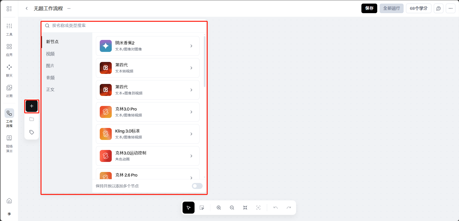 点击画布左侧的「+」按钮,打开节点选择面板。