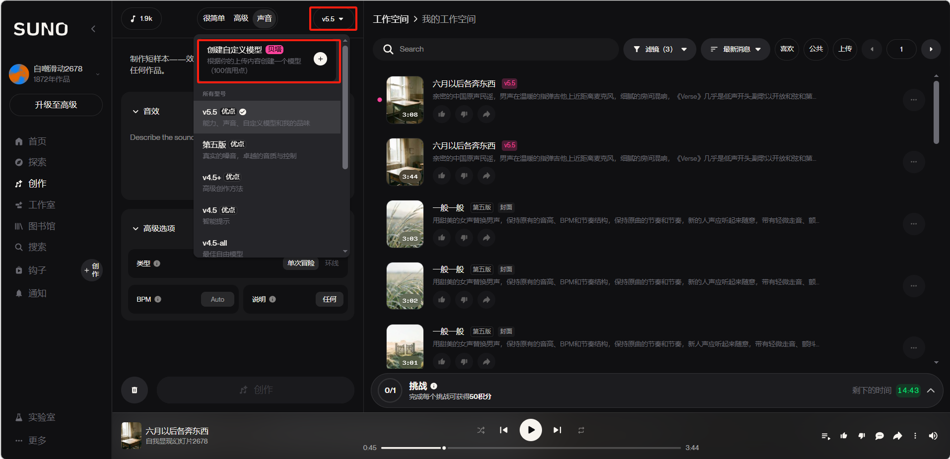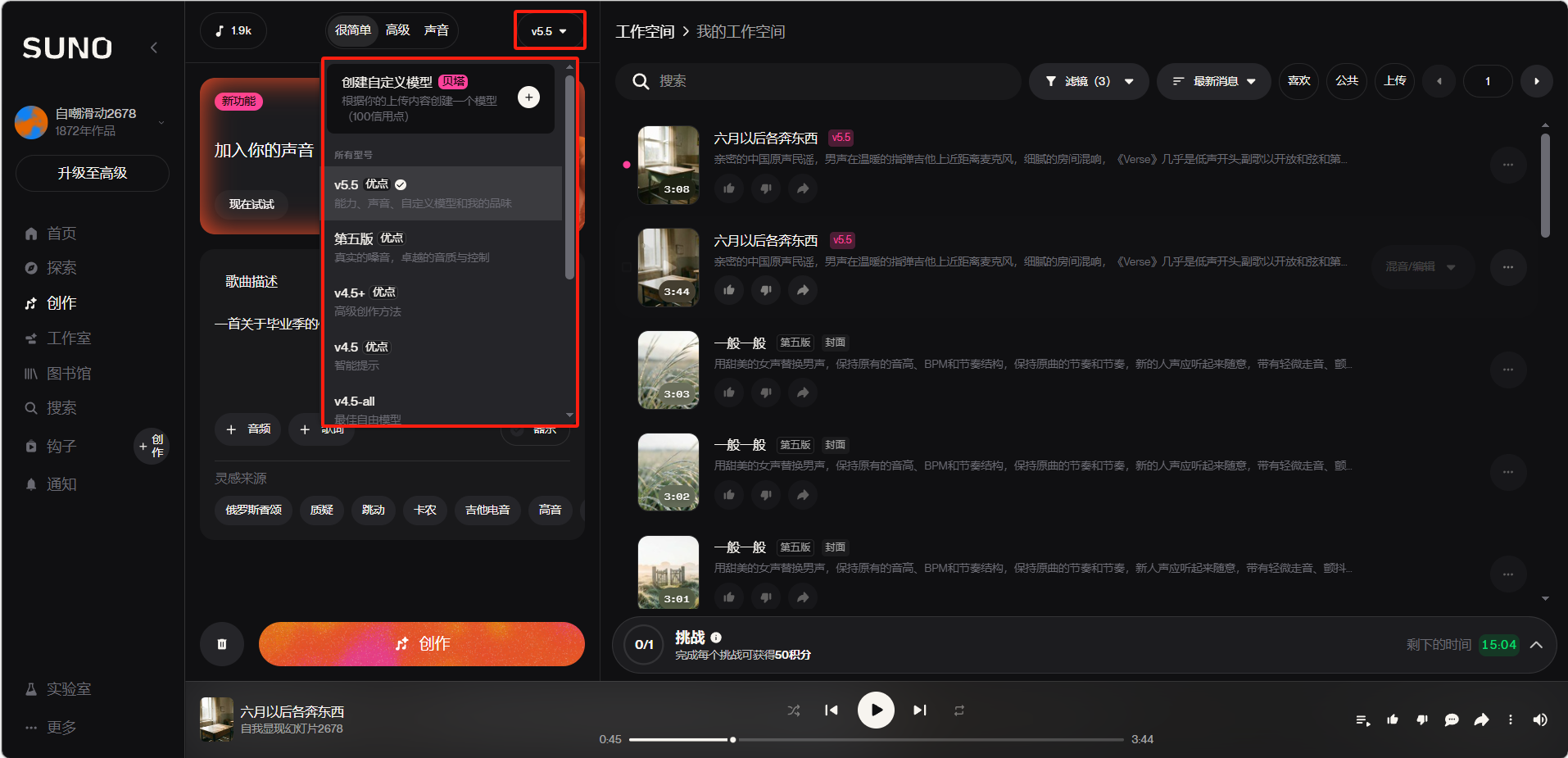 在创作页面的右上角,用户可以选择不同的模型版本。Suno 目前提供以下模型:
