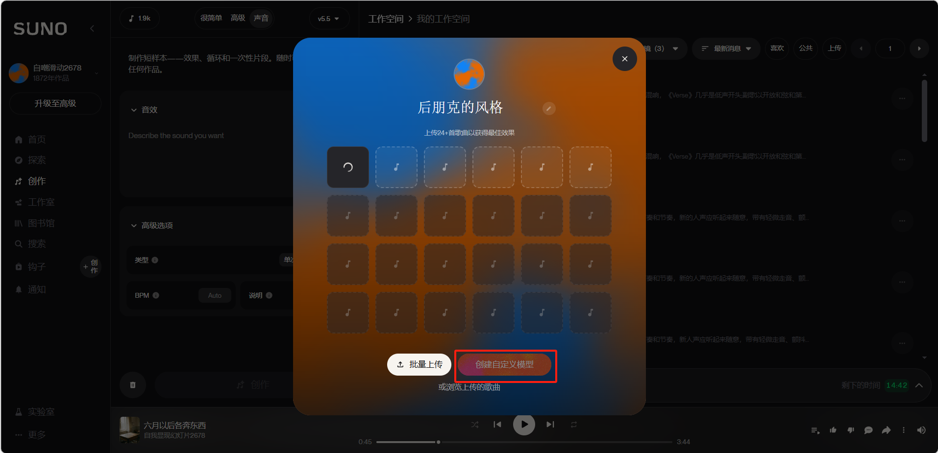 Suno支持用户上传自己的歌曲素材来创建专属的声音模型(Persona)。用户可以上传已有的歌曲作品,Suno会分析并学习其中的声音特征,从而训练生成一个个性化的声音模型。之后用户便可以使用这个专属模型来创作新的歌曲,让AI生成的音乐保持一致的声音风格和特色。