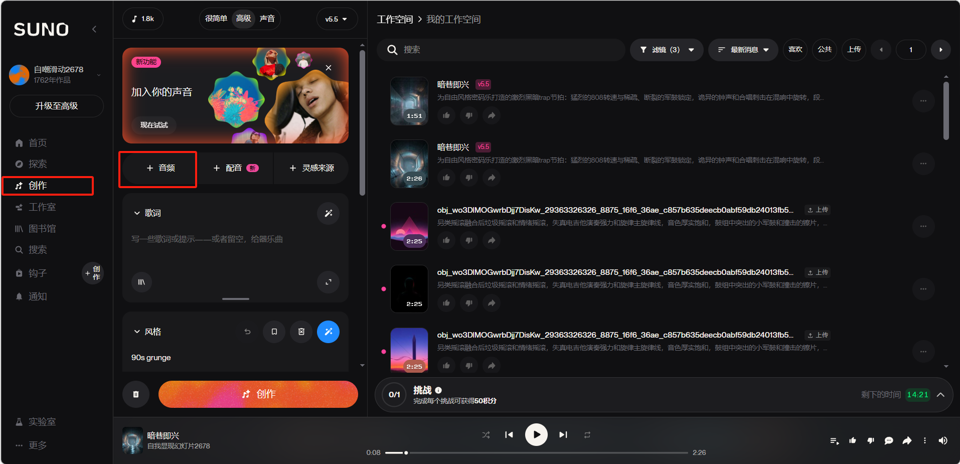 "添加音频"功能允许用户上传自己的音频素材,让 Suno 基于用户的音频进行创作。