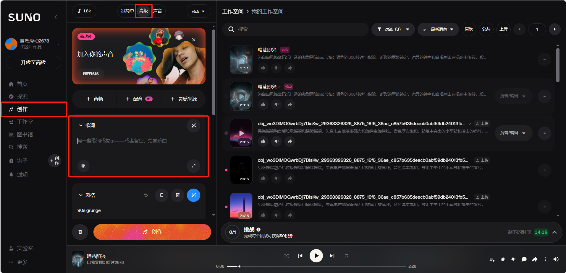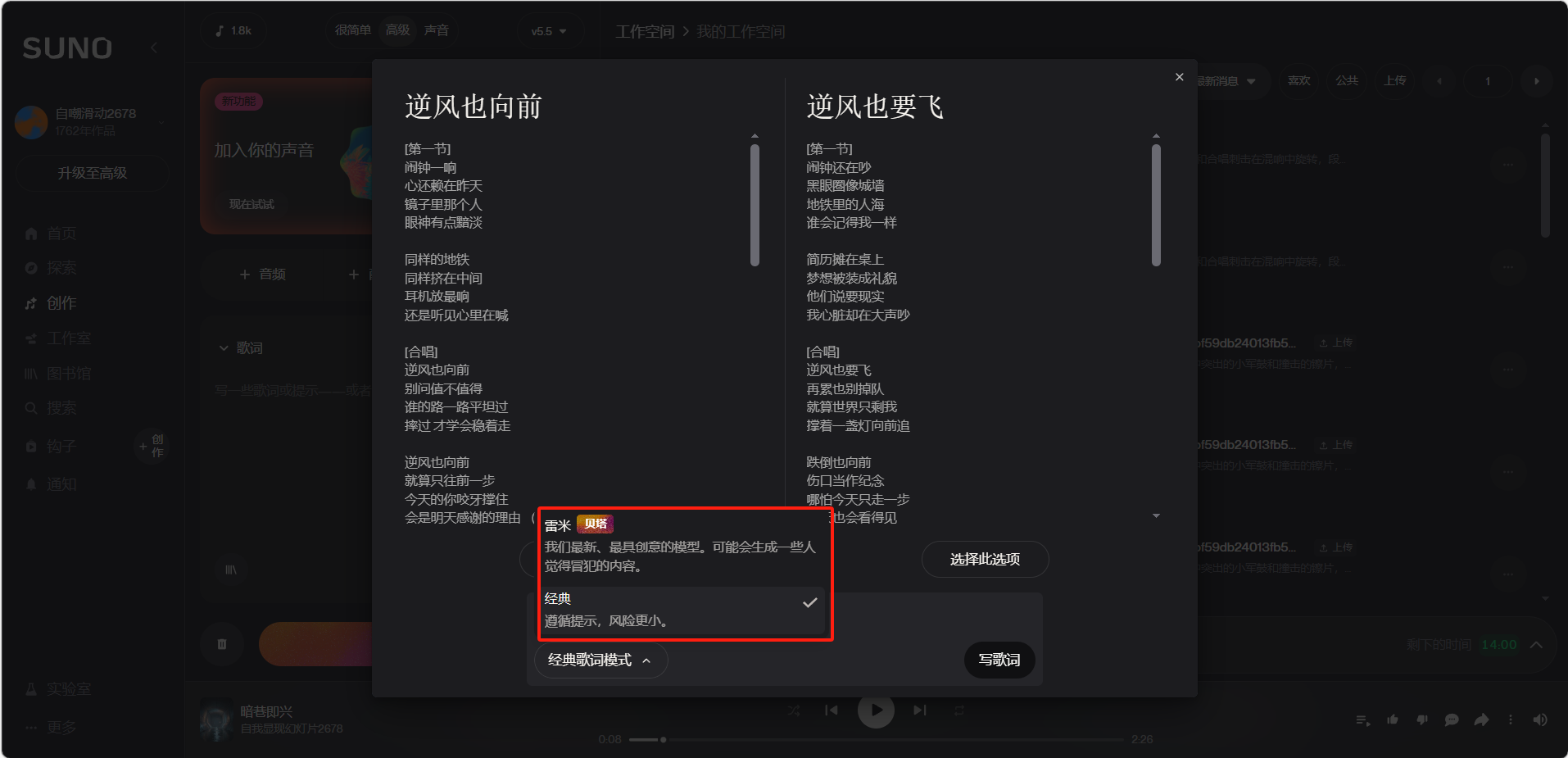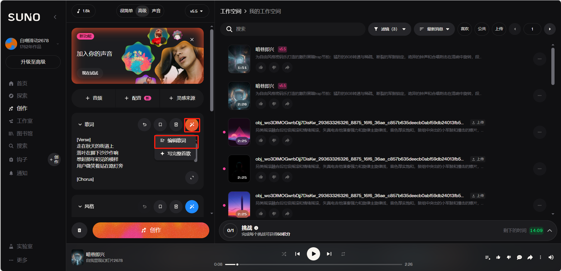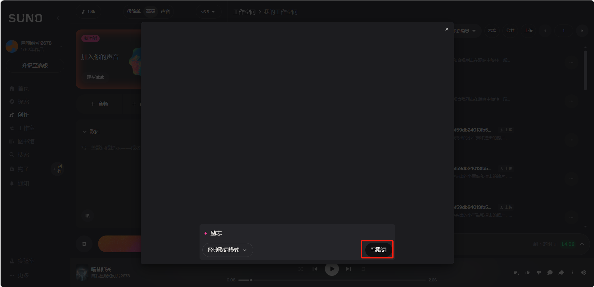 「歌词」功能让用户可以输入自己创作的歌词,由 Suno 为其谱曲并演唱。