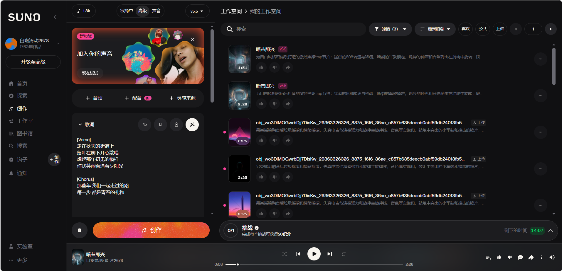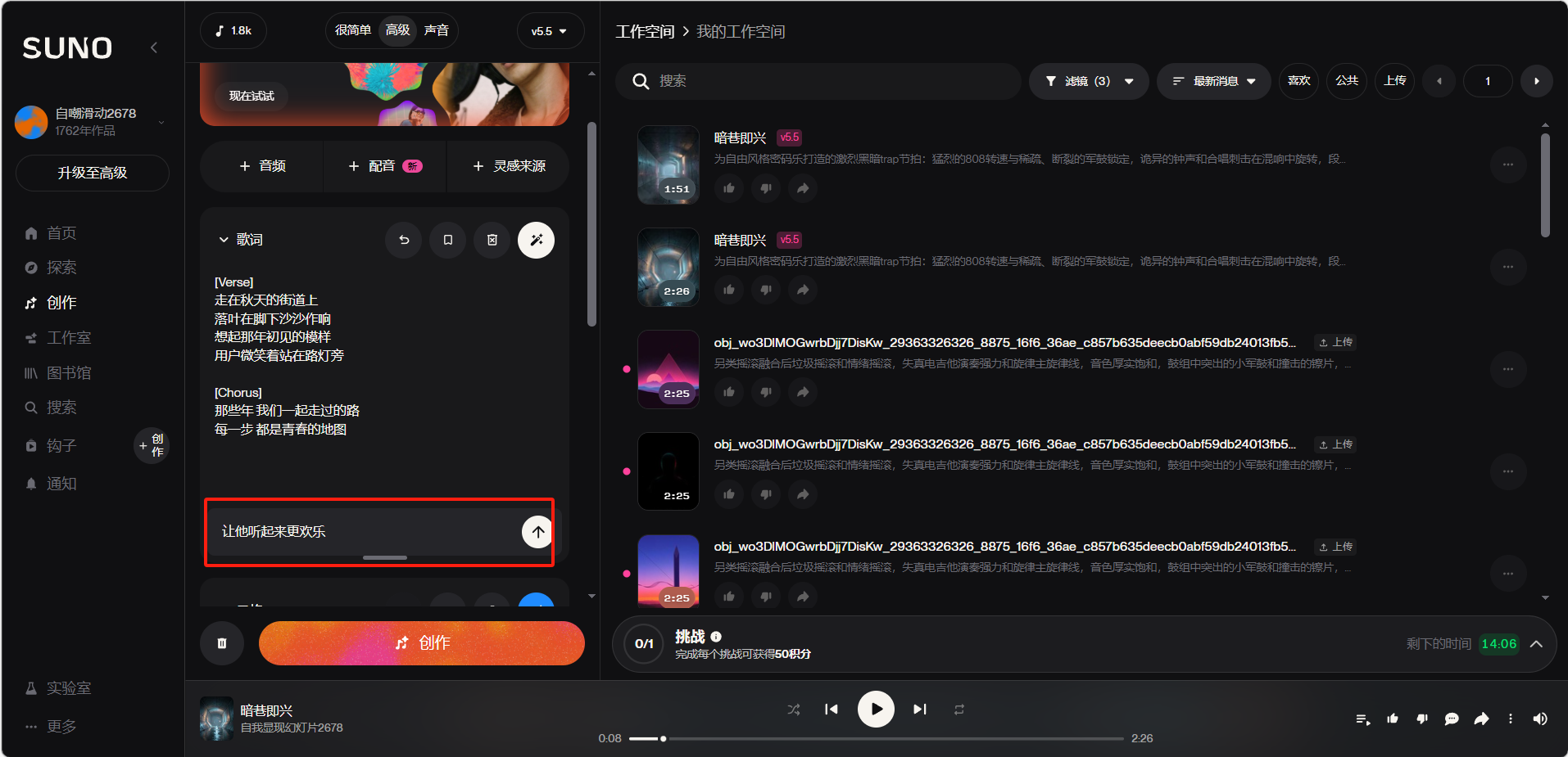 Suno拥有内置的AI歌词生成模型,用户无需自己编写歌词,只需提供简单的主题、情绪或关键词描述,系统便会自动生成完整的歌词内容,包括主歌、副歌、桥段等结构。用户也可以在生成的基础上进行手动修改和调整,灵活地将AI创作与个人想法相结合,大大降低了歌词创作的门槛。