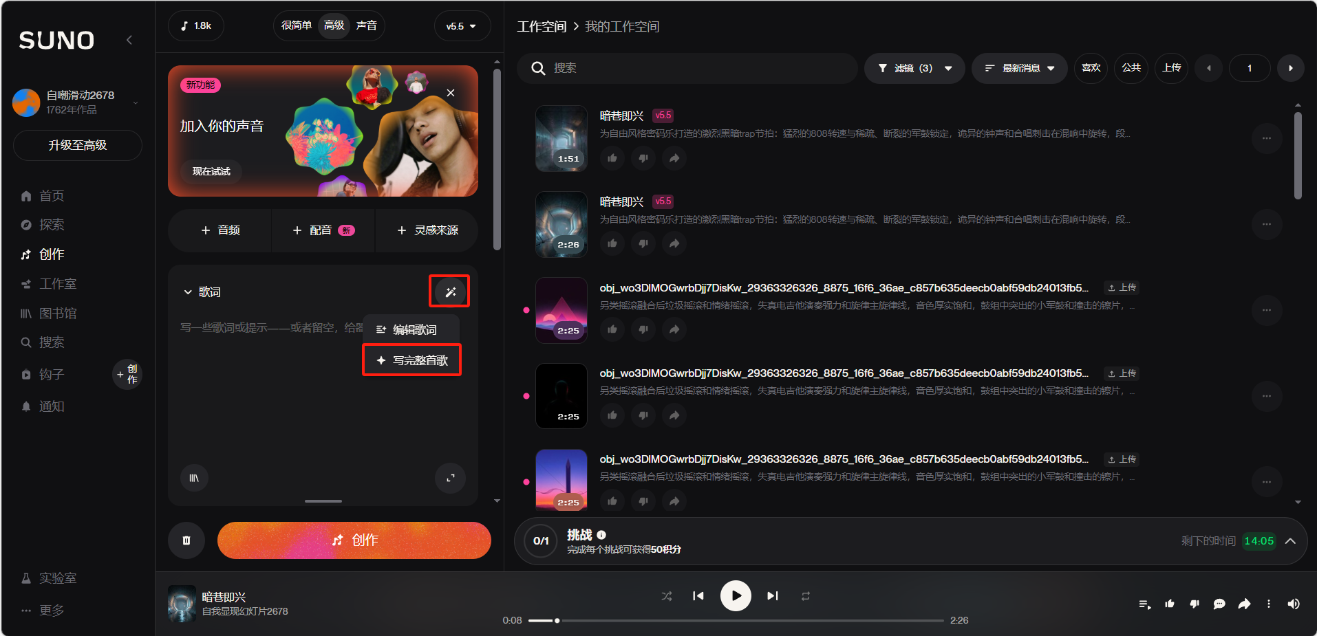 在歌词面板中点击魔法棒图标,选择「写完整首歌」。