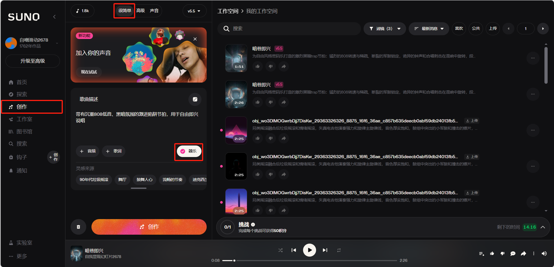 在创作面板「很简单」模式中有一个「器乐」开关,打开后 Suno 将只生成器乐部分,不会添加任何人声歌唱或歌词。器乐模式生成的音频非常适合用作视频背景音乐、播客配乐、游戏音效、短视频素材等场景。与有人声的歌曲不同,器乐模式让用户可以专注于音乐本身的编曲、氛围和情绪表达。