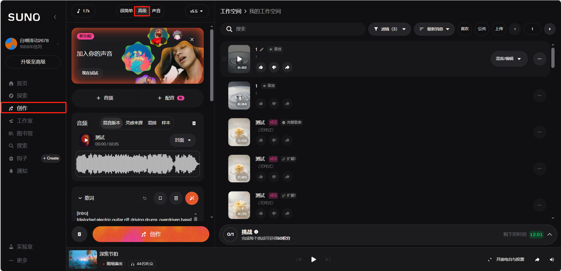 高级模式是 Suno 中面向进阶用户的创作入口,提供更精细的控制选项,适合对音乐风格、歌词结构和音频素材有明确需求的创作者。