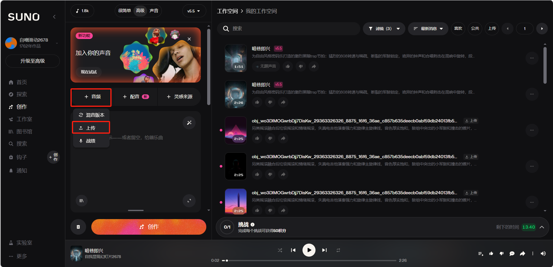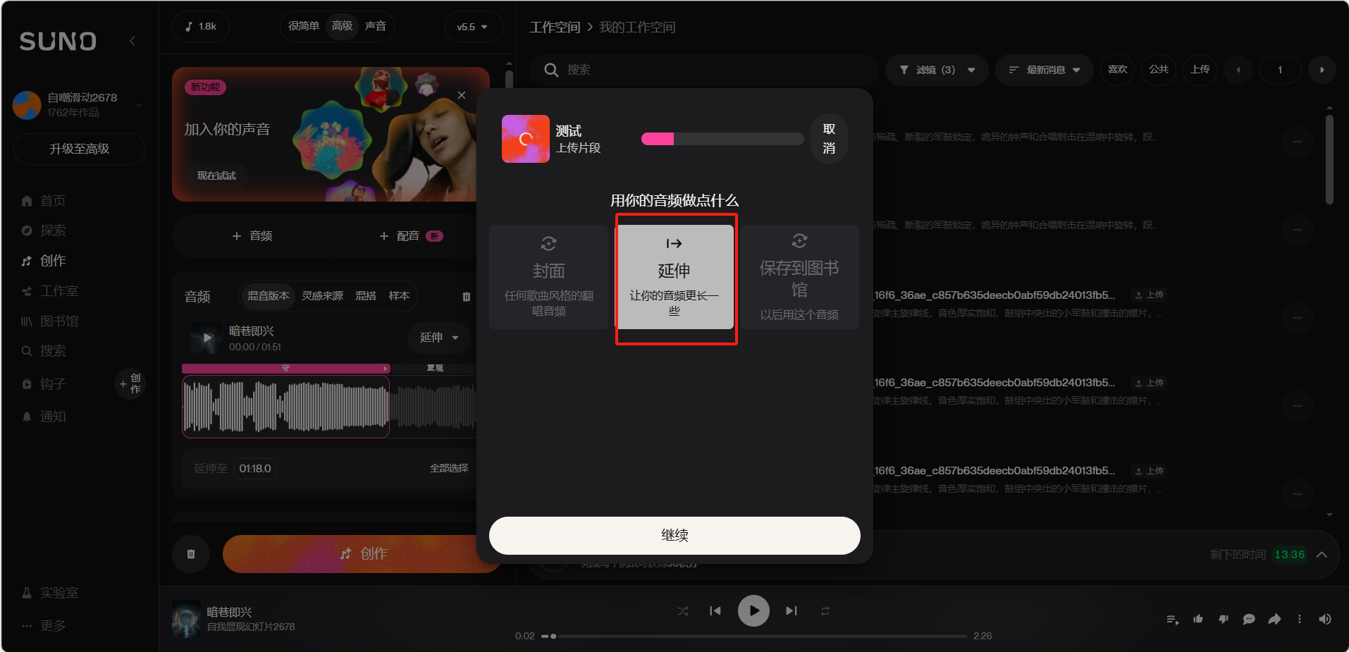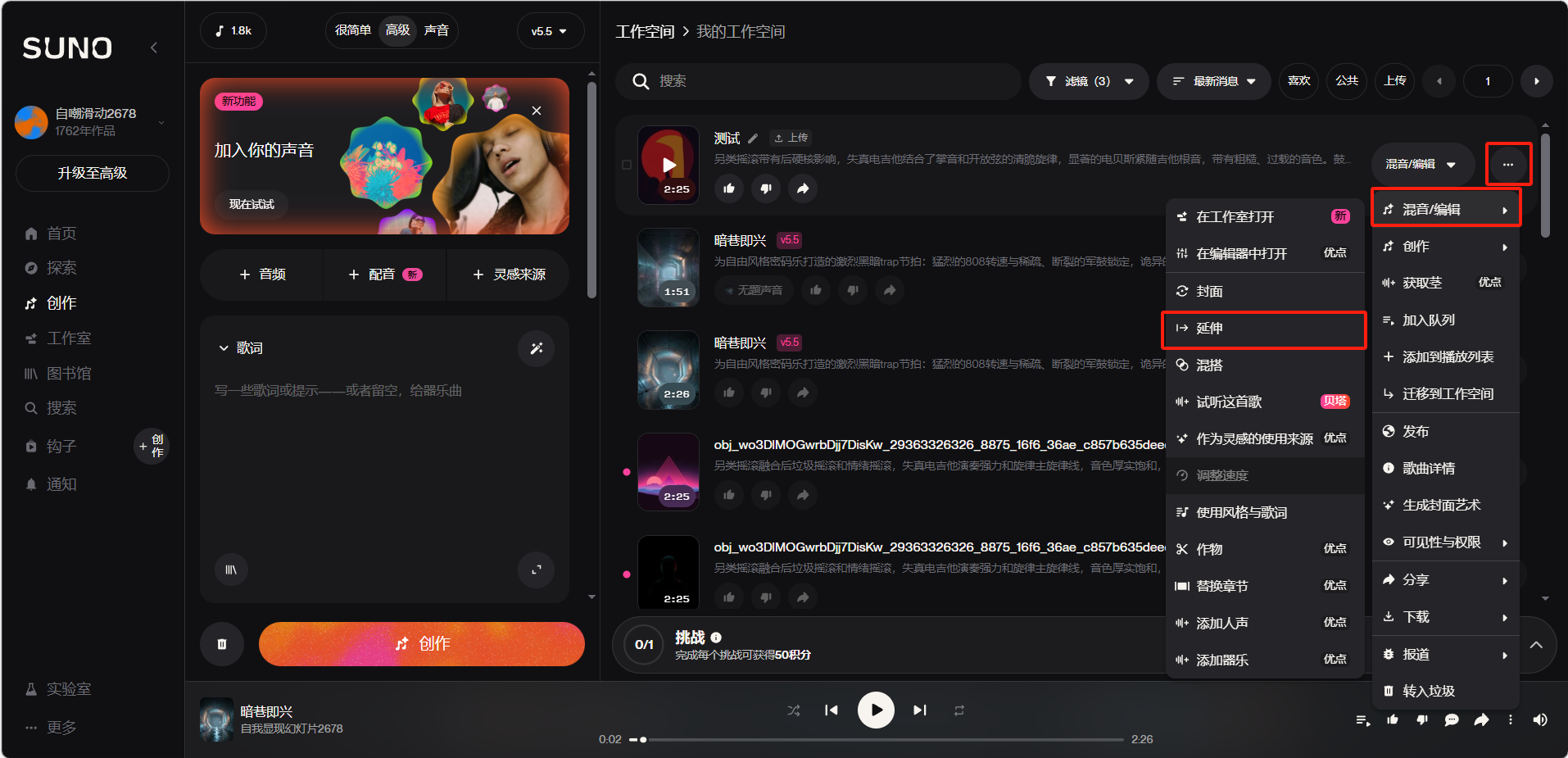 点击「创作」>「高级」,在右侧工作空间中找到想续写的歌曲,点击歌曲旁边的「...」>「混音/编辑」>「延伸」。