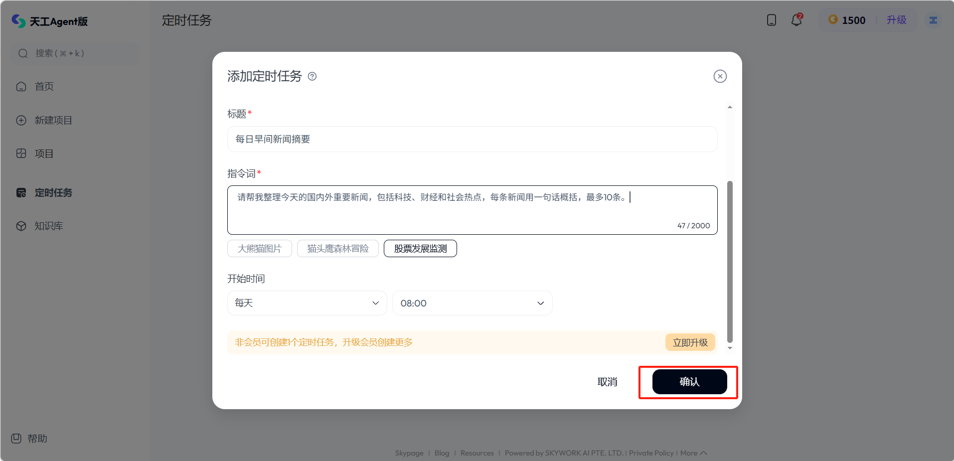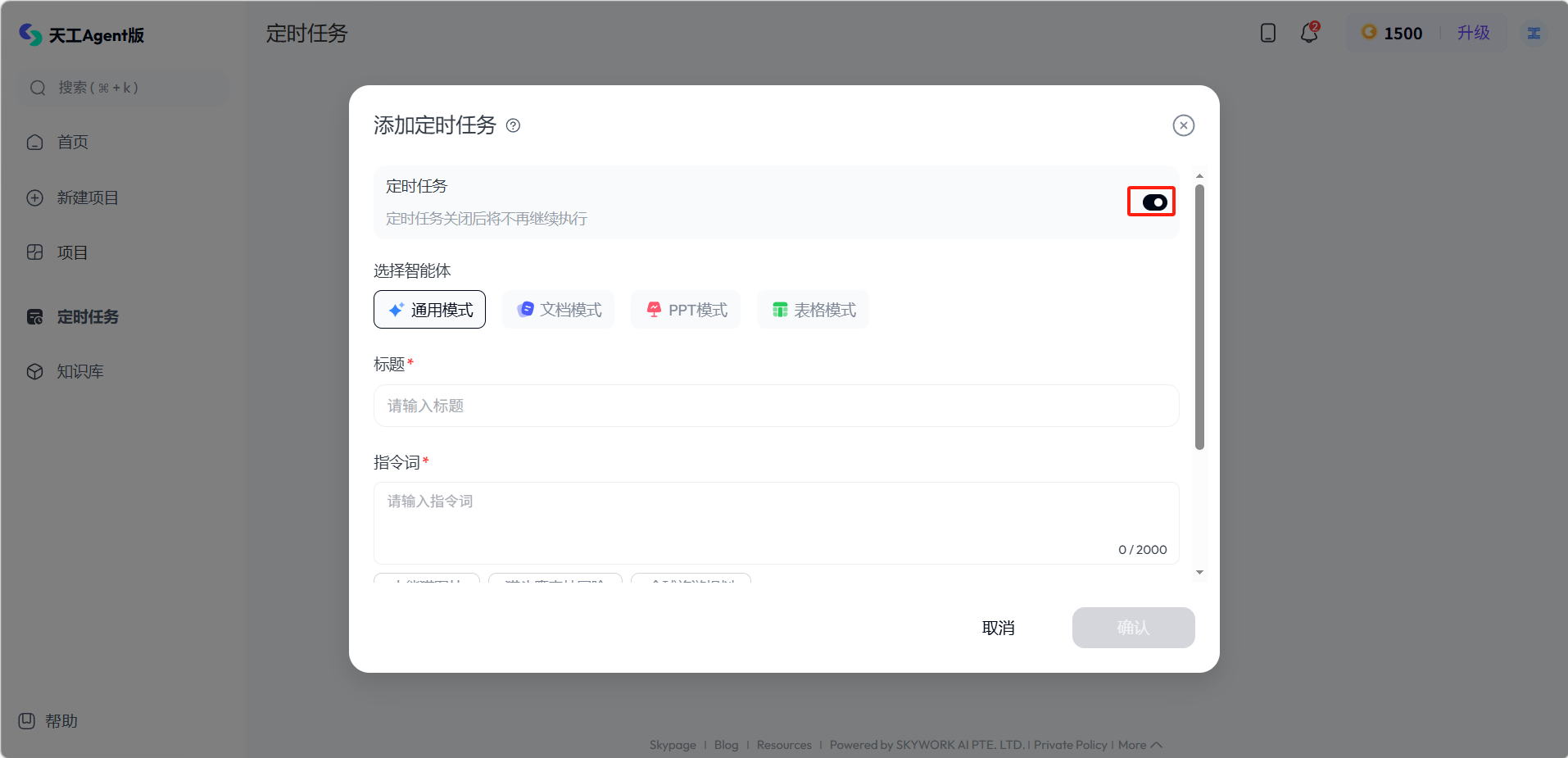 填写任务标题、开始时间和指令词。指令词是你希望天工执行的具体内容描述,最多支持2000字。指令词写得越详细、越具体,生成的结果质量越高。