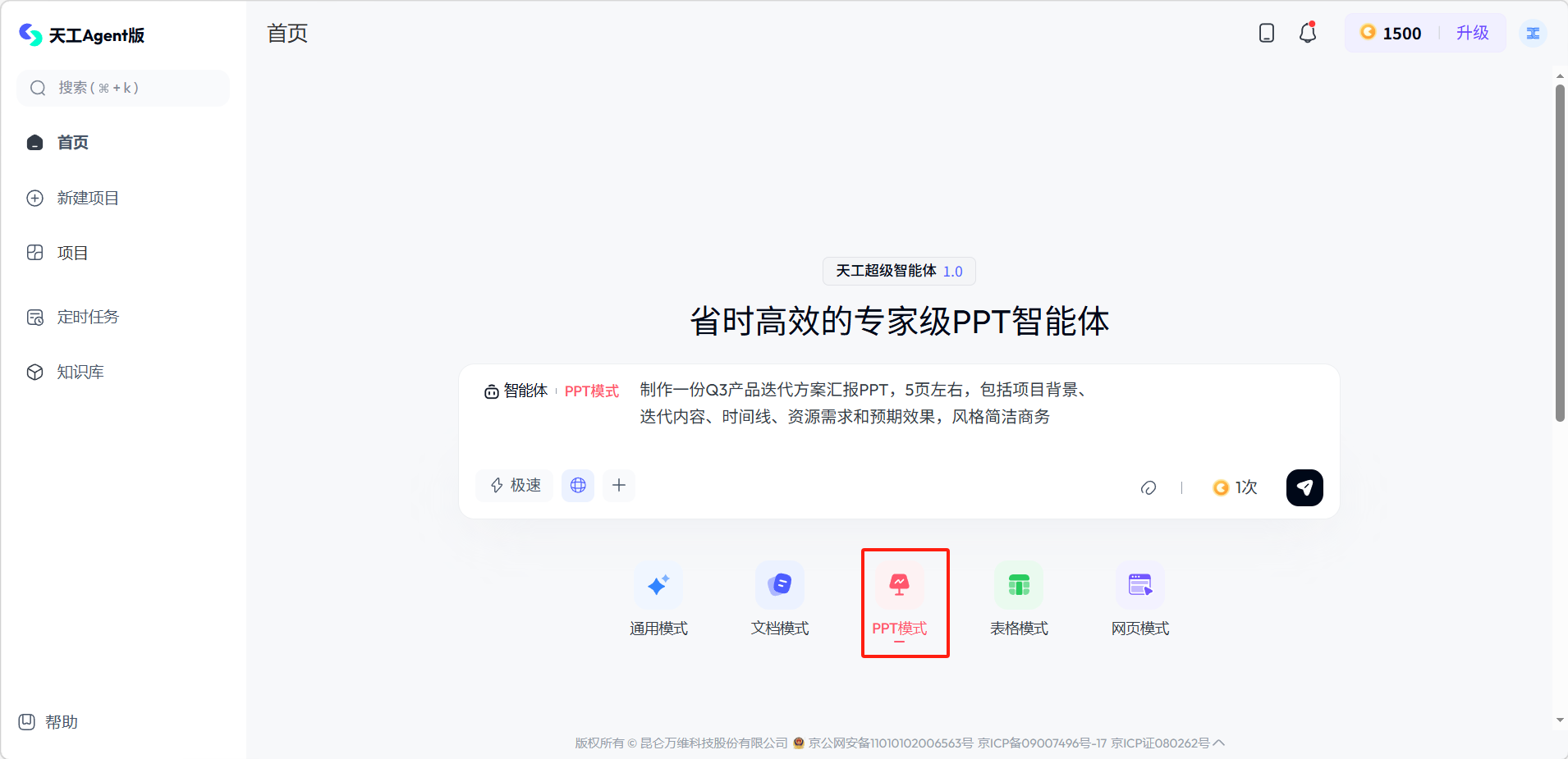 选择对话框下方的「PPT模式」,选择制作模式后输入需求。