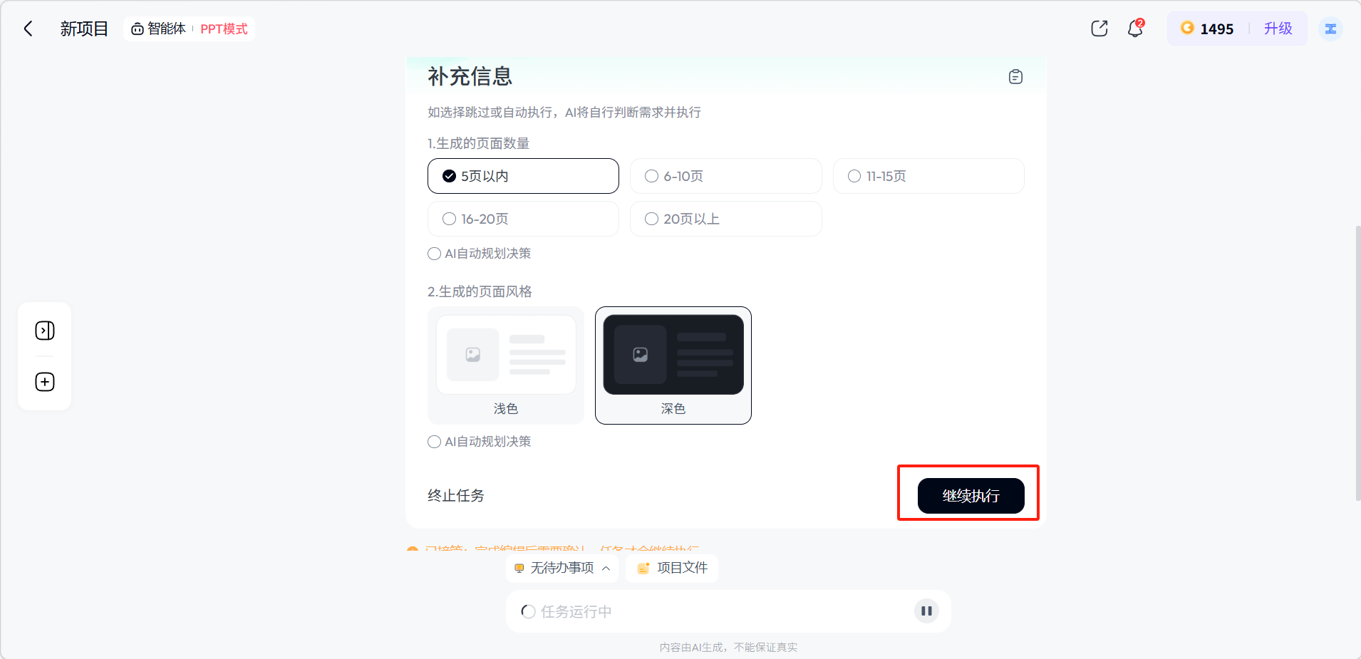 选择补充信息后点击「继续执行」,也可以跳过。等待一段时间后即可生成PPT。