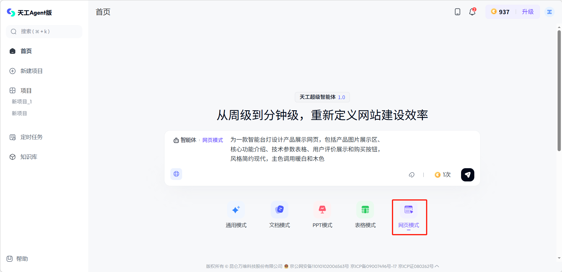 网页模式是天工的网页设计与开发一体化智能体。它将设计师和前端开发工程师的工作合二为一——你完全不需要懂HTML、CSS或JavaScript等任何编程语言,只需要用自然语言描述你想要一个什么样的网页,AI就能从零到一生成一个完整的、可运行的网页。生成的网页支持在线实时预览——你可以直接在天工中看到网页的最终效果。确认满意后,可以导出为 HTML 文件。导出的文件是完整的、独立的网页代码,你可以直接在浏览器中打开、部署到自己的服务器上、或者交给开发团队进行二次开发。点击对话框下方「网页模式」即可使用。