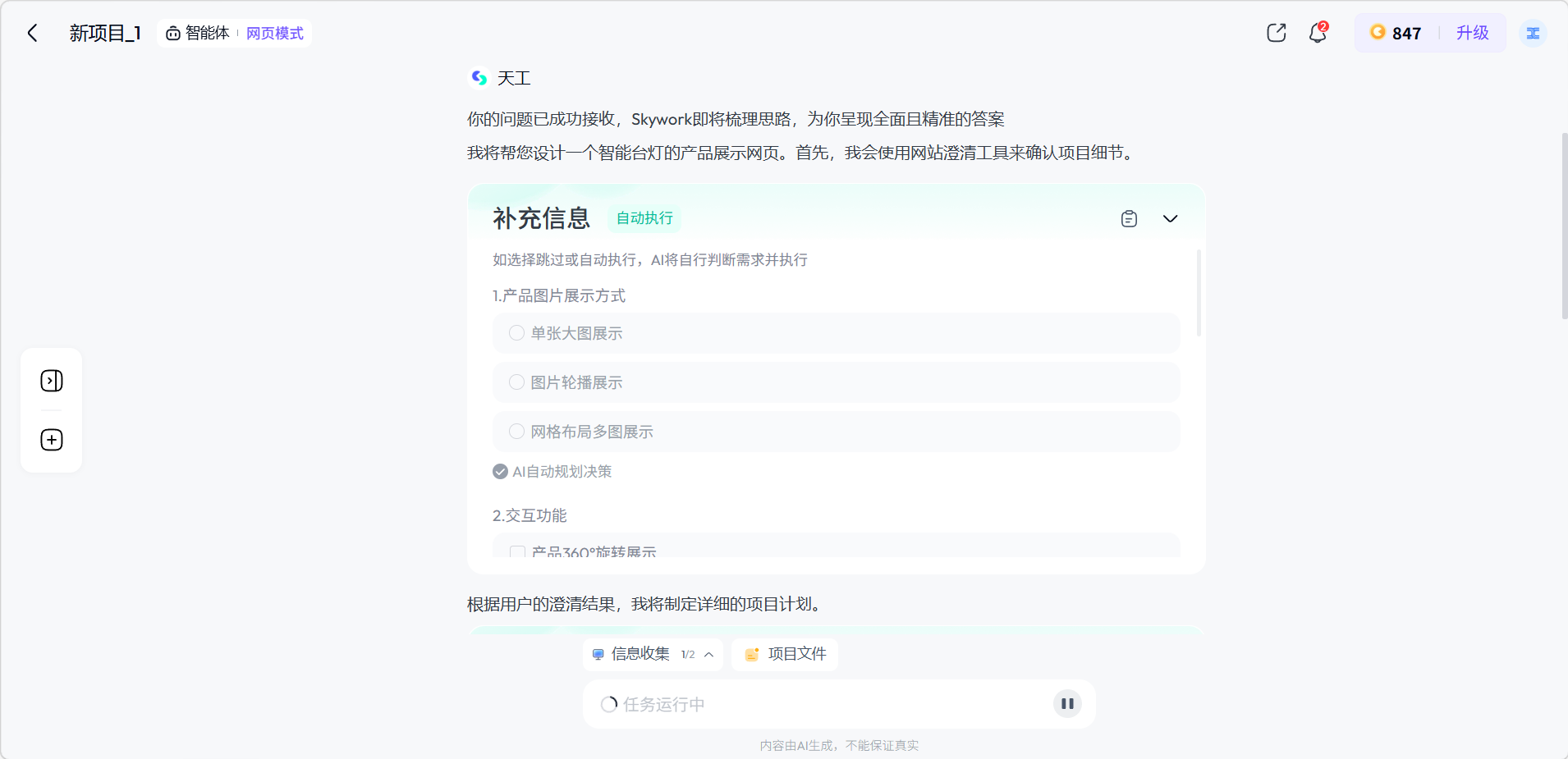 填写补充信息,也可以跳过让AI自动选择。等待一段时间后即可生成网页。