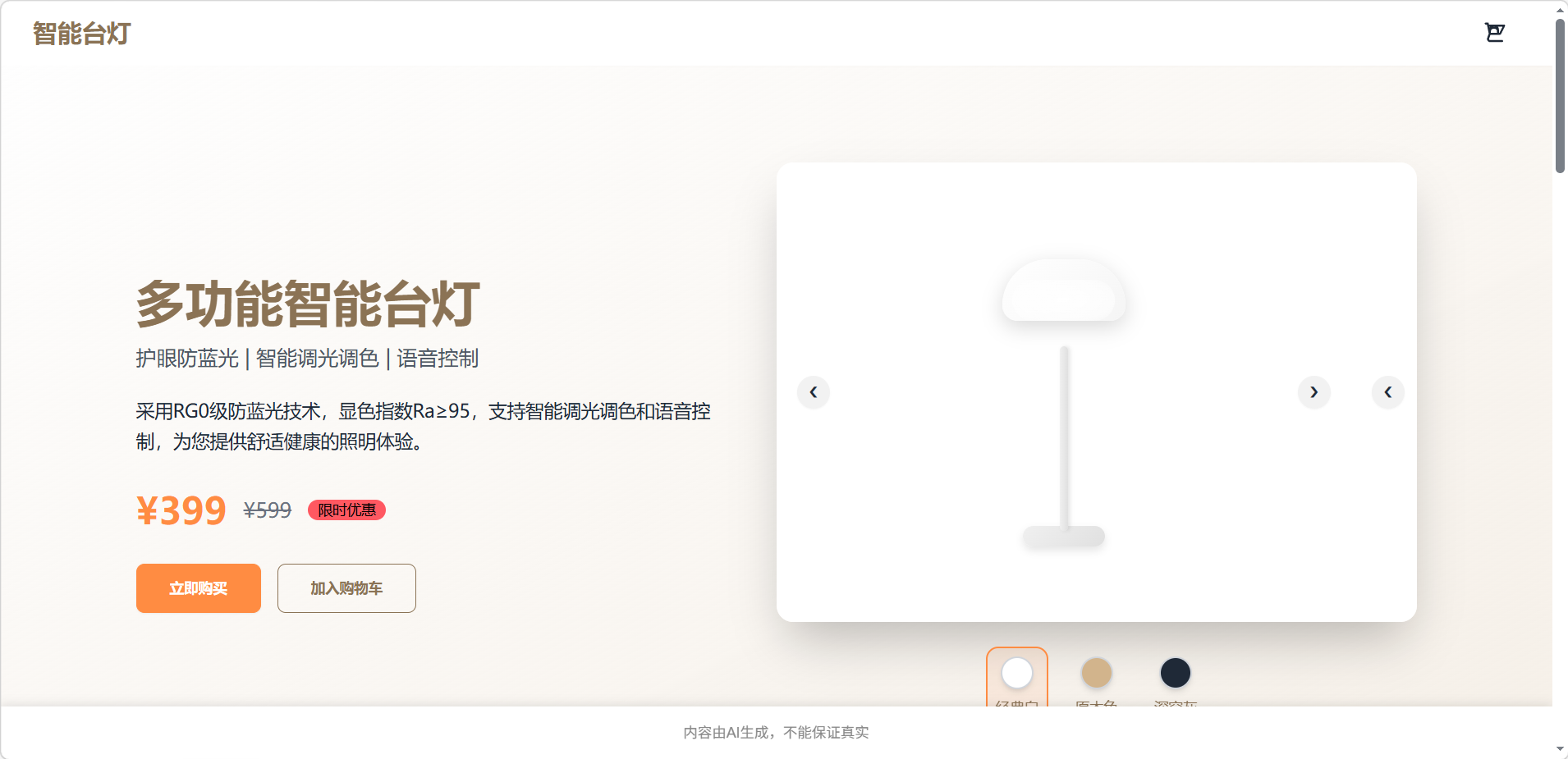 - 多次迭代:生成后可以追问修改,如"把导航栏改成固定在顶部"、"增加一个FAQ板块"