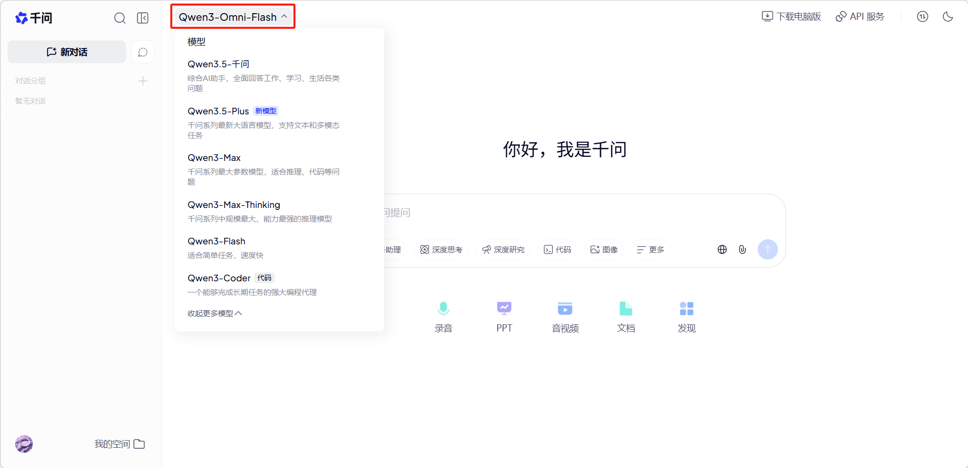 千问提供了丰富的模型供用户选择,适应不同的任务需求。在对话界面左上角点击模型名称即可切换。