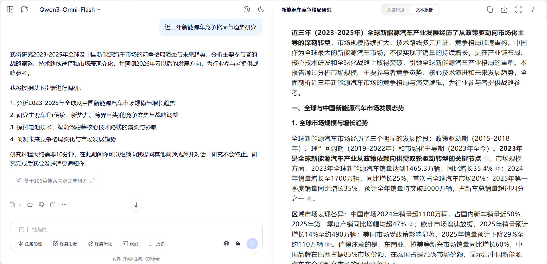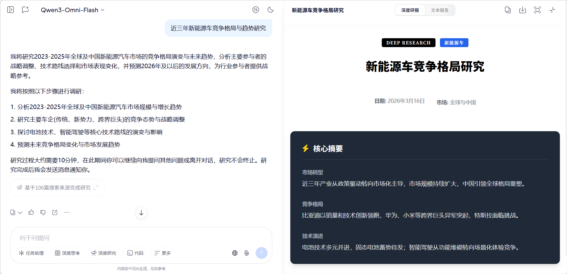 这里让千问研究了近三年的新能源车竞争格局与趋势。由于深度研究的结果更丰富更有深度,所以需要等待一段时间才能出结果。旁边也可以看到千问的研究过程。