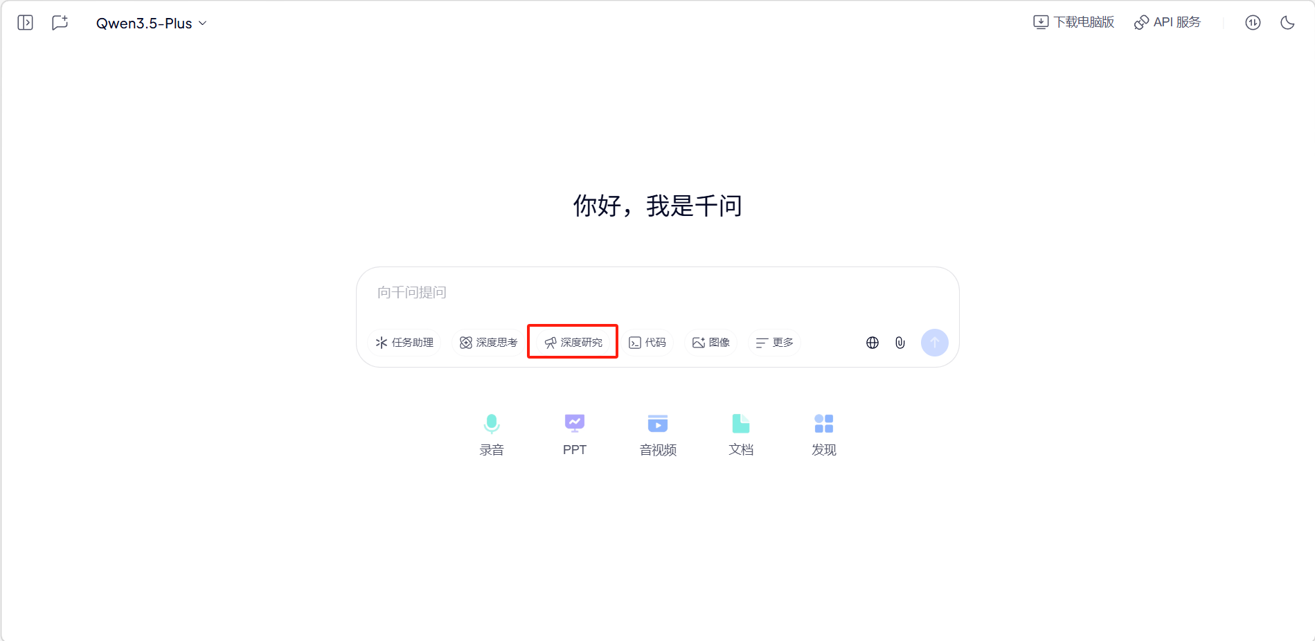 在输入框下方选择「深度研究」模式后输入需求即可。