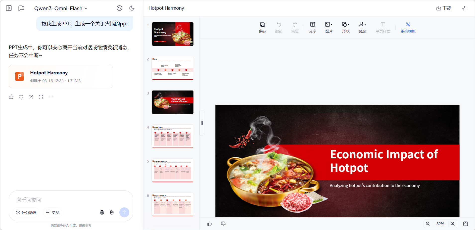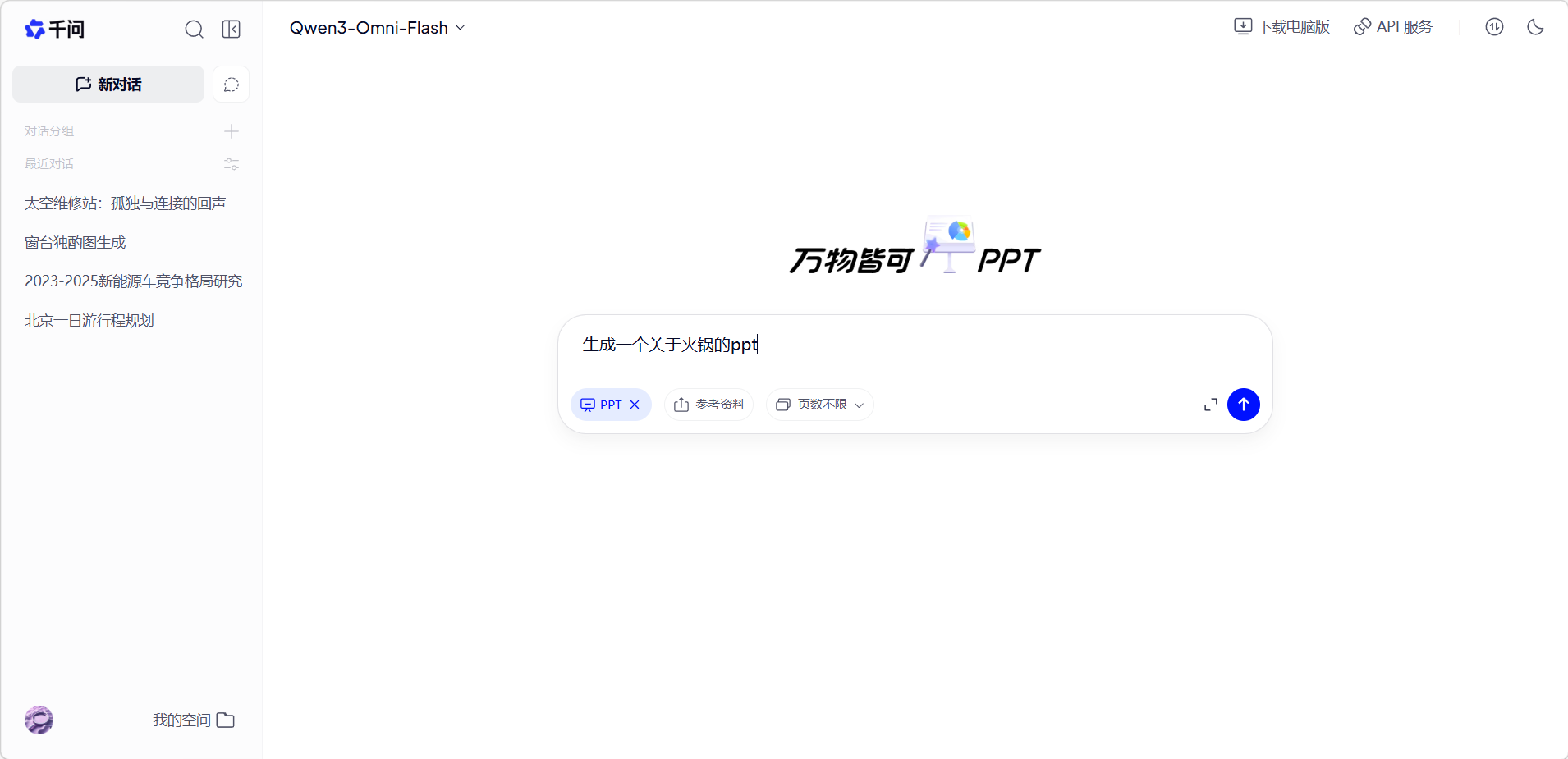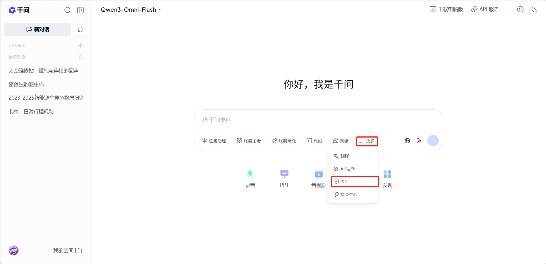 通义千问支持根据主题或已有文档一键生成完整 PPT,自动完成内容撰写、排版配图,告别手动做 PPT 的烦恼。生成的文件可直接导出为 .pptx 格式,在 PowerPoint 或 WPS 中打开编辑。在对话框下方选择「更多」>「PPT」即可使用。