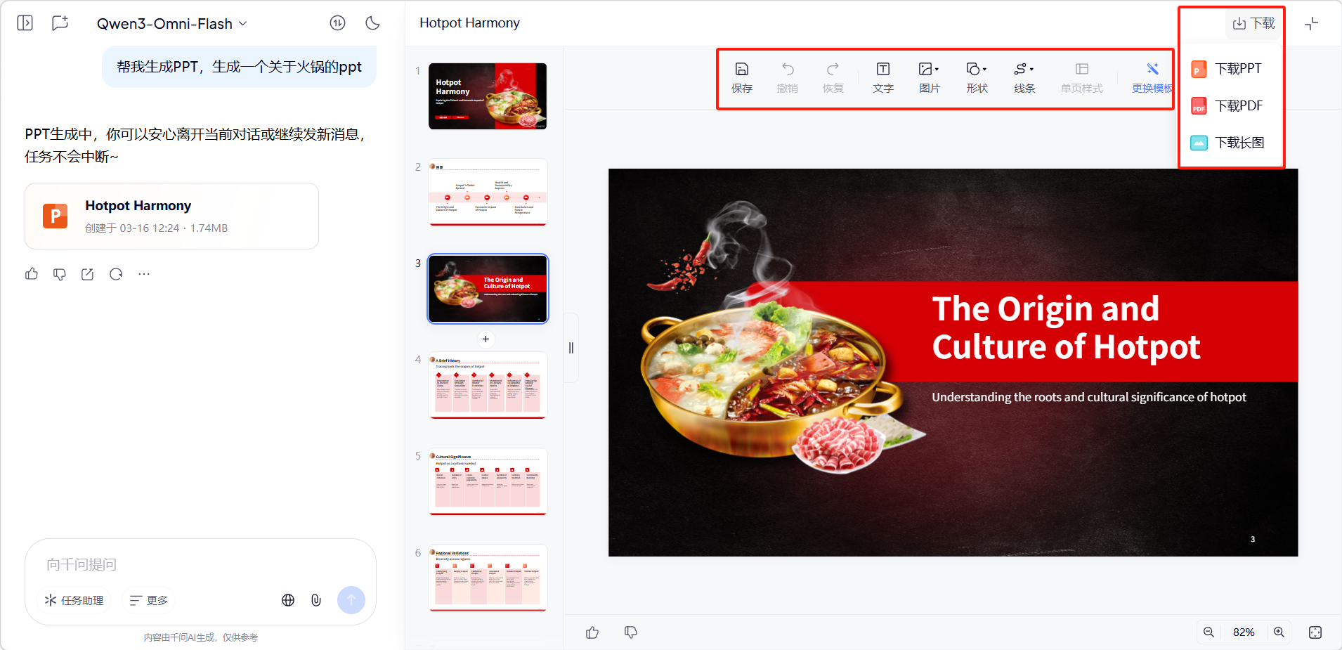可以直接在生成PPT的页面编辑PPT,或者更换模板。用户编辑完成后即可点击右上角的「下载」按钮进行下载,千问提供了PPT、PDF、长图三种下载方式,用户可以自行选择下载。