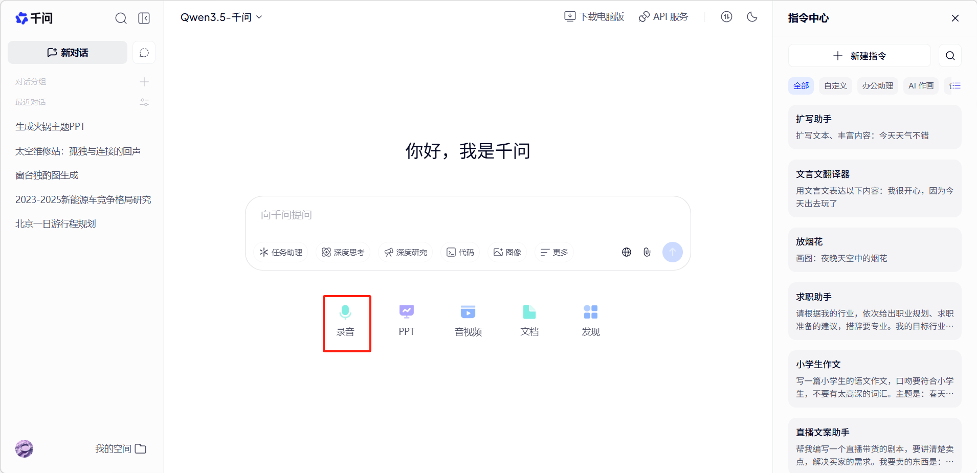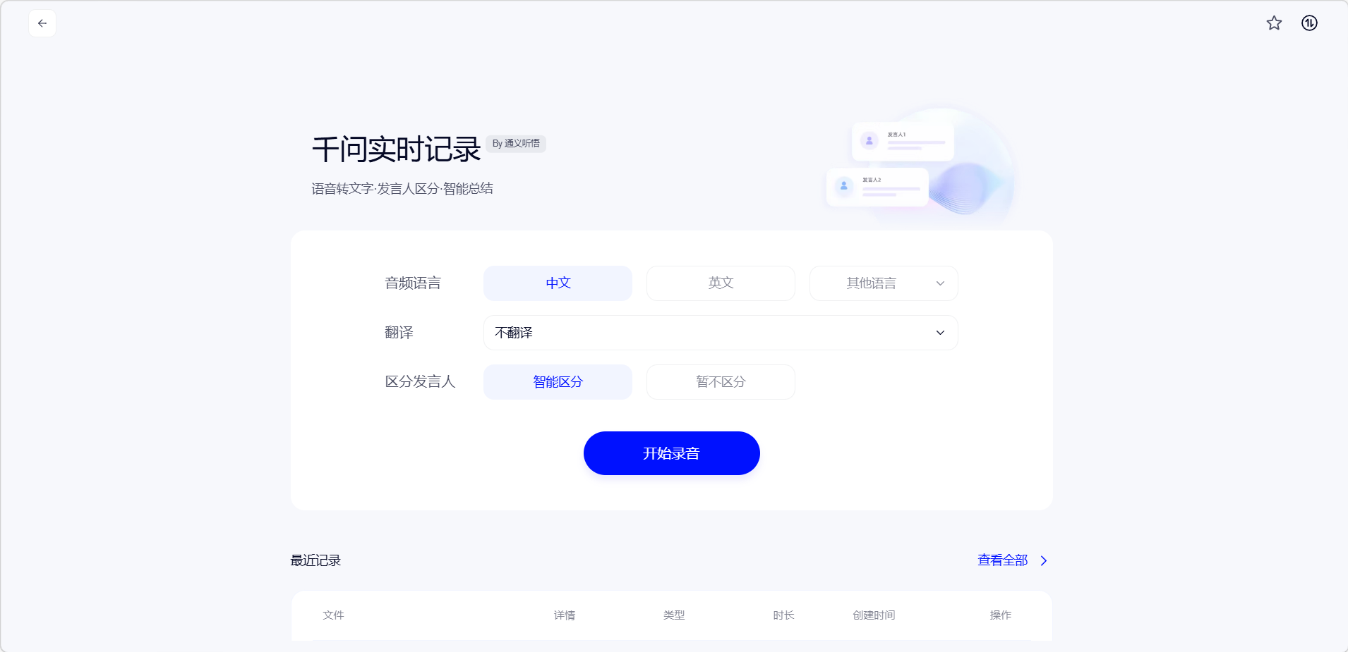 千问实时记录功能(由通义听悟提供技术支持),能够实时录制语音并转换为文字。录完后自动生成文字内容并进行整理分析。同时支持智能总结和发言人区分。