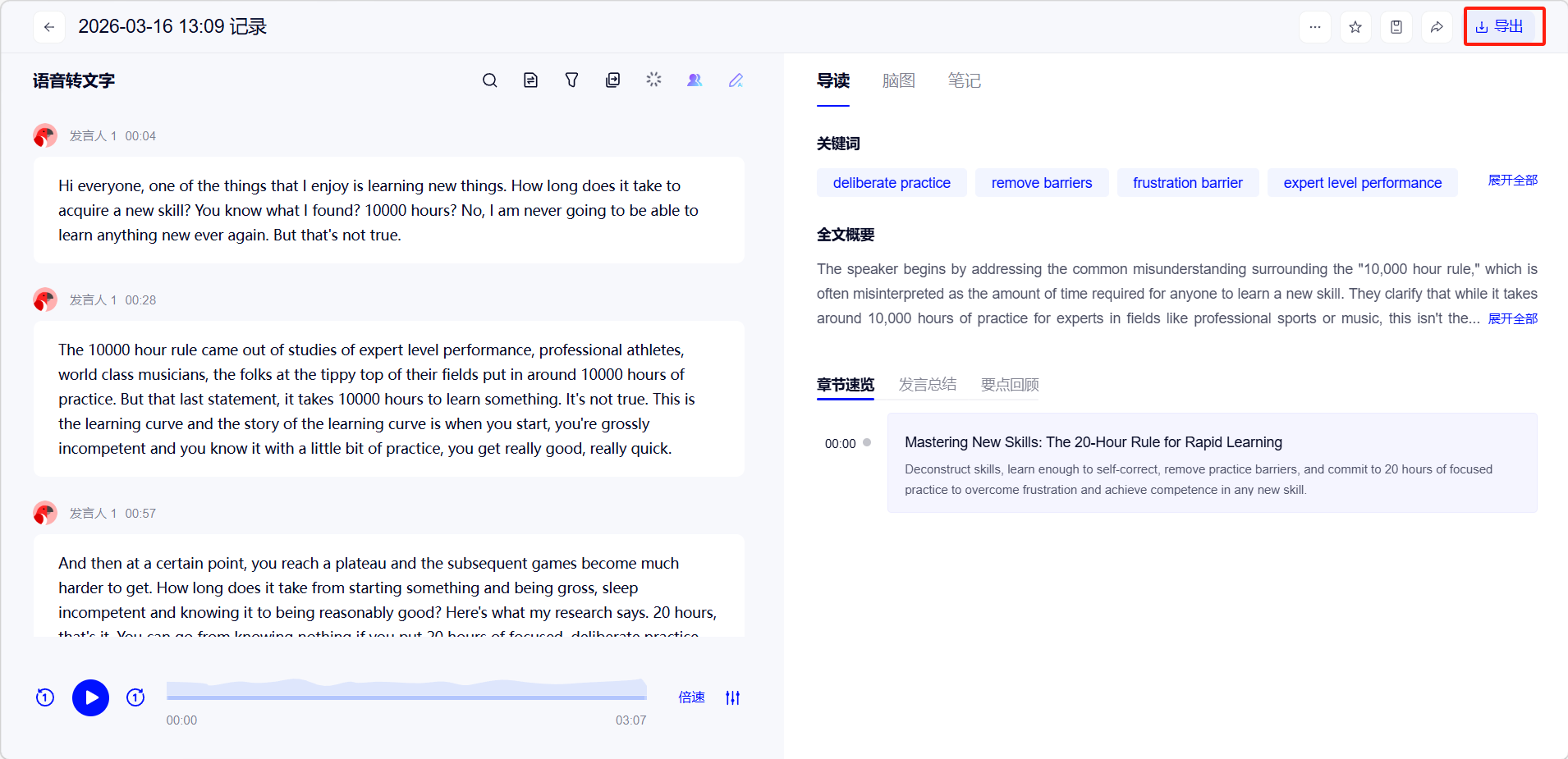 生成完成后用户可以点击右上角的「导出」按钮进行导出。